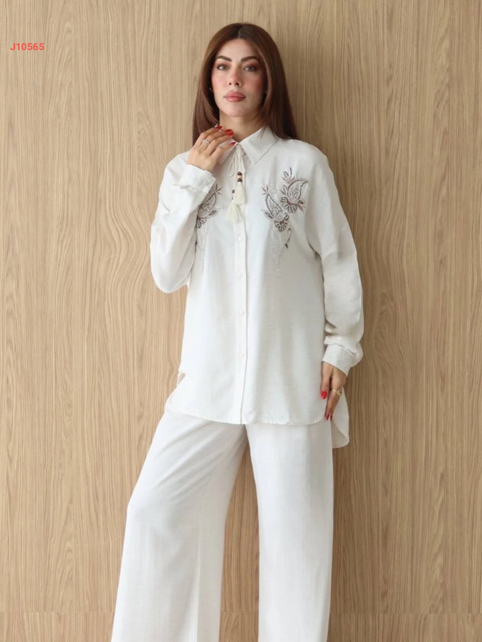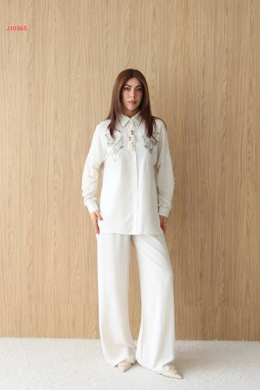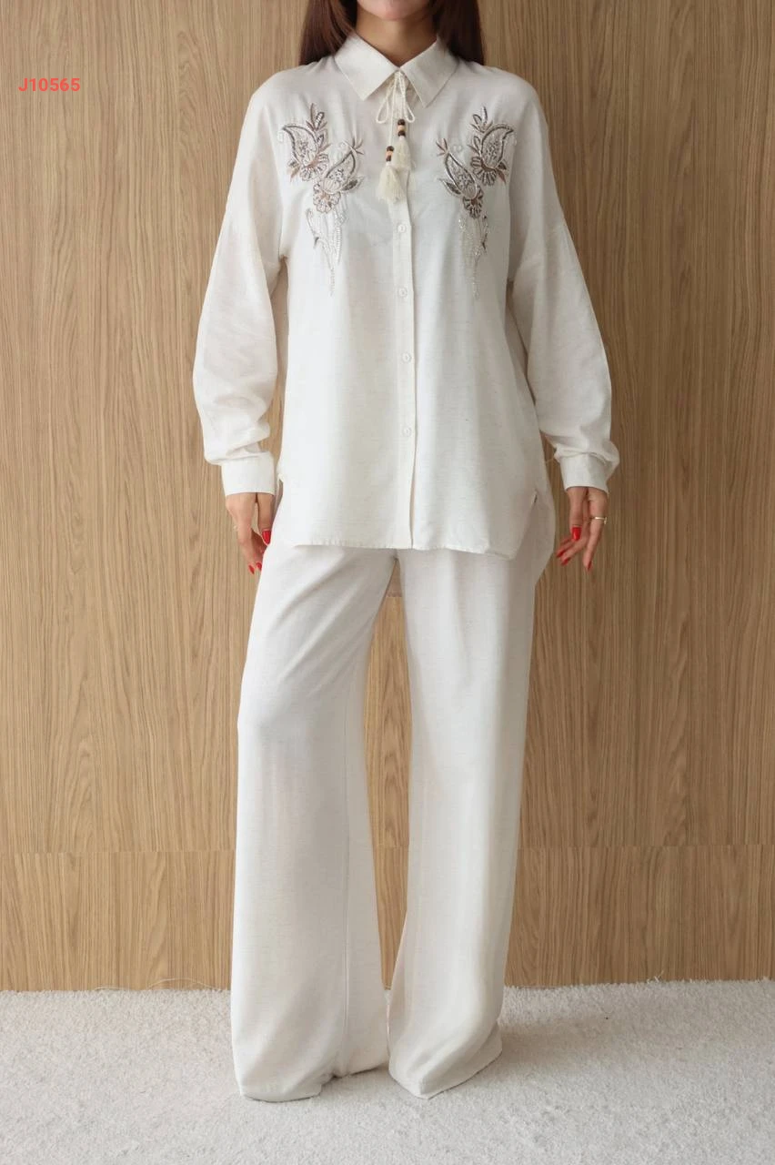 طقم بنطال كتان وقميص مطرز
