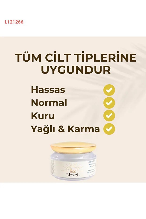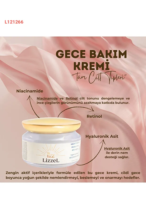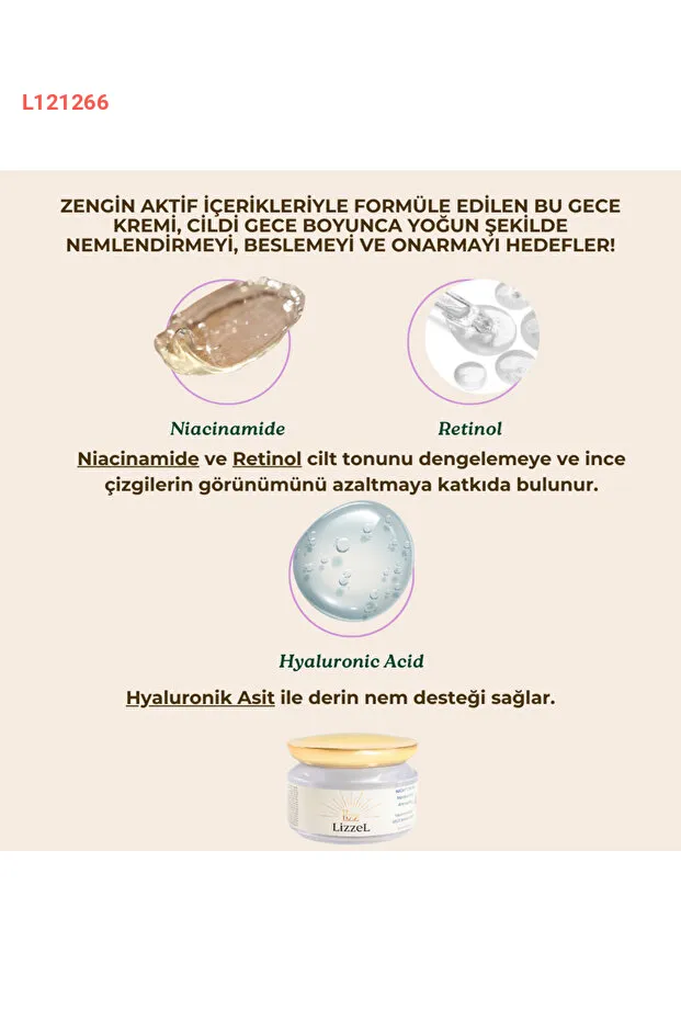 استمتعي بنوم هانئ ووجه مشرق مع كريم الليل LizzeL، الذي يجمع بين الترطيب العميق ومزايا مقاومة الشيخوخة. غني بالمواد الفعالة، يعمل على تجديد خلايا البشرة أثناء النوم، مما يساعد على تقليل التجاعيد وظهور علامات التقدم في السن، لتستيقظي صباحًا ببشرة ناعمة ومضيئة. دللي نفسك مع هذا الكريم الفاخر لتحصلي على إشراقة شبابية تدوم!