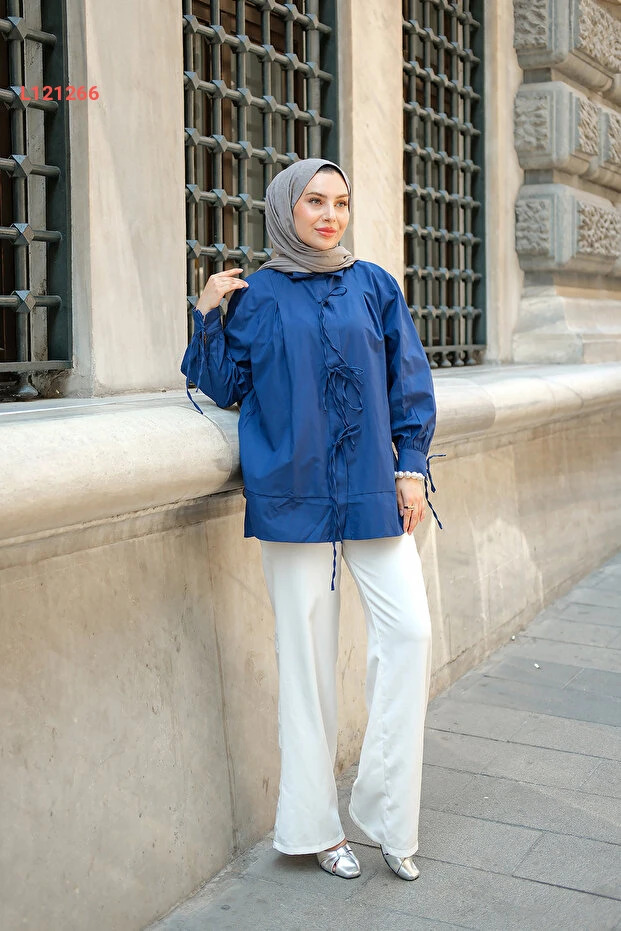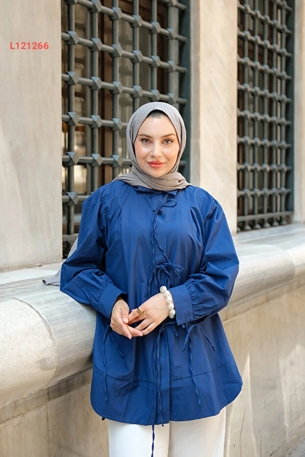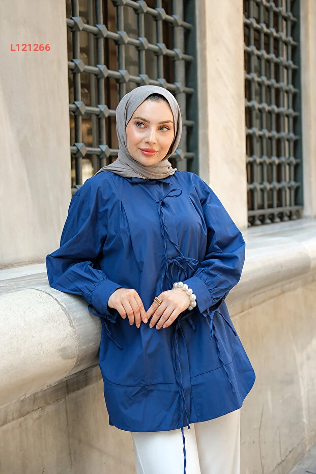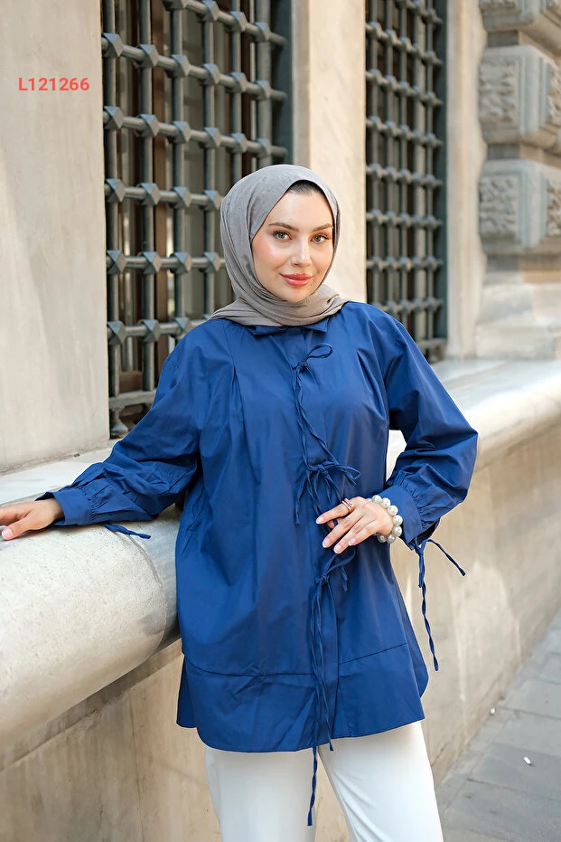 قميص نسائي بتصميم بيضاوي مع تفاصيل رباط أمامي - لون أزرق داكن
