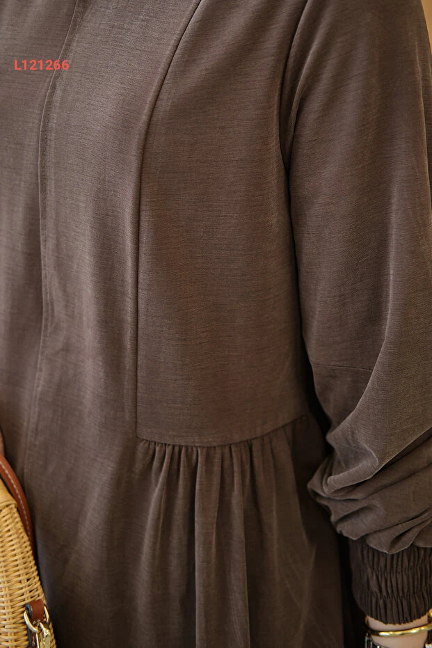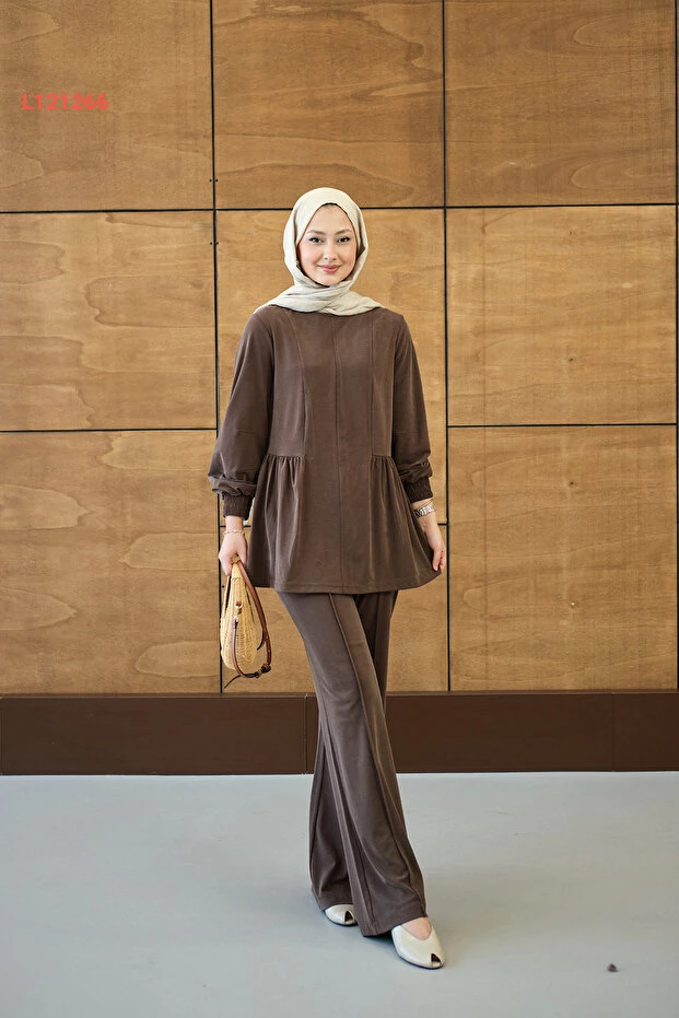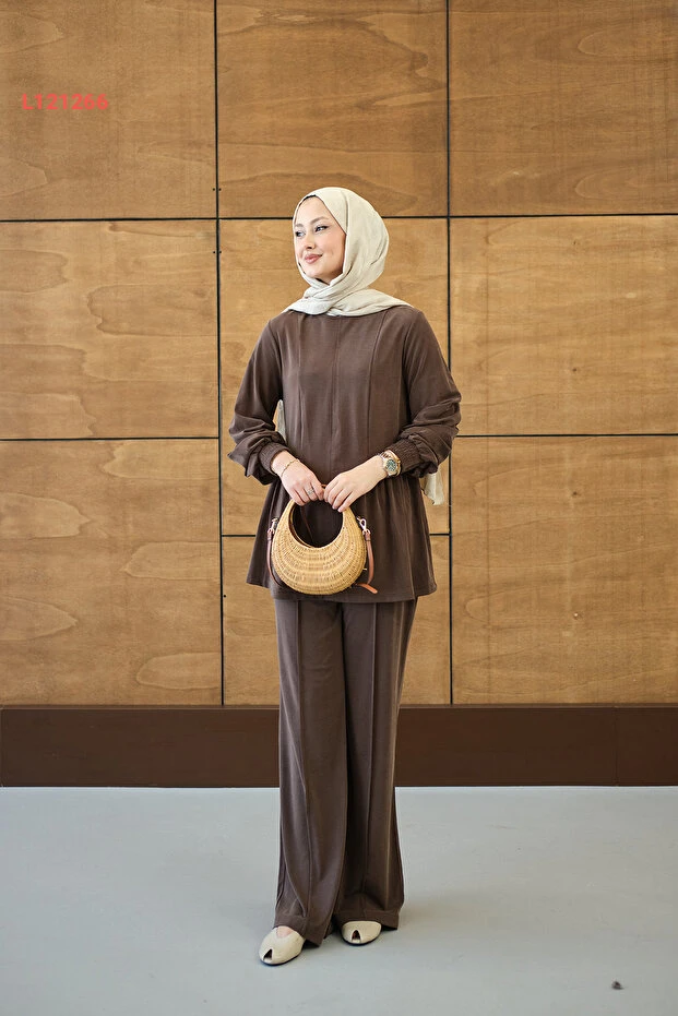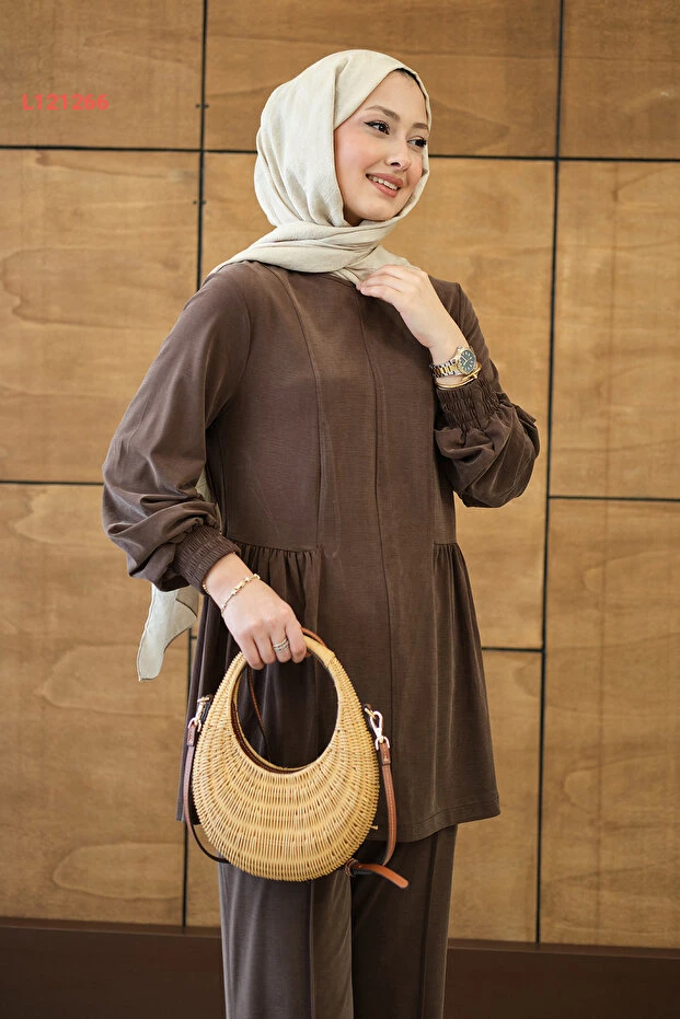 طقم لوكو النسائي ذي التفاصيل المنقوشة والتجاعيد - بني