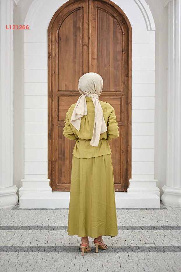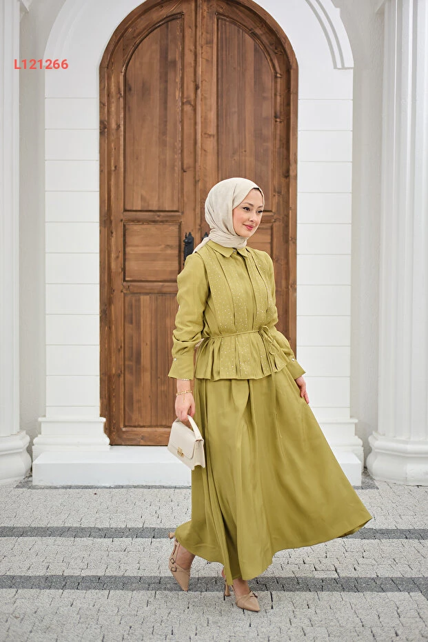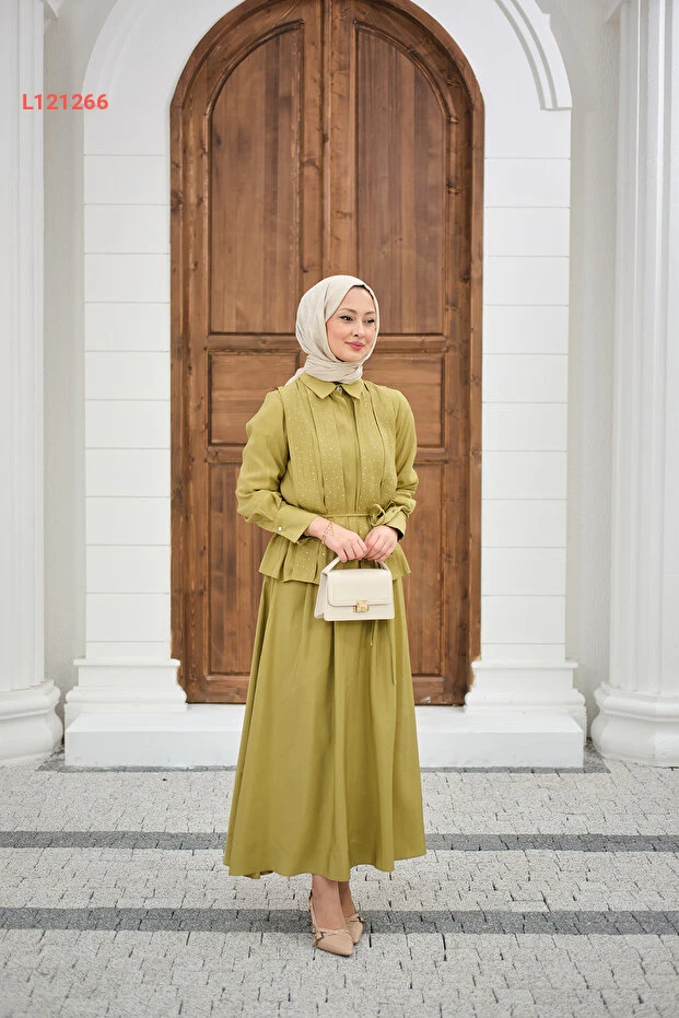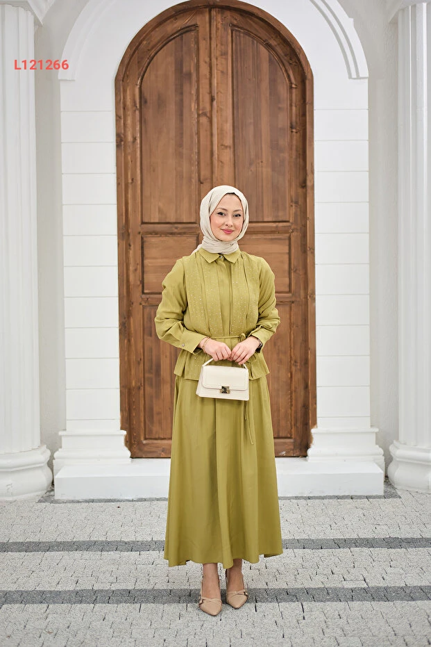 تألقي بإطلالة أنيقة مع طقم LOCCO الذي يجمع بين الأنوثة والراحة. يتميز بلون زيتوني جذاب وزخارف حجرية تضيف لمسة من الفخامة، بينما يضمن التصميم الخفي للأزرار وخصر الرباط راحة مثالية وجاذبية لا تقاوم. ارتديها في أي مناسبة لتكوني محط الأنظار.