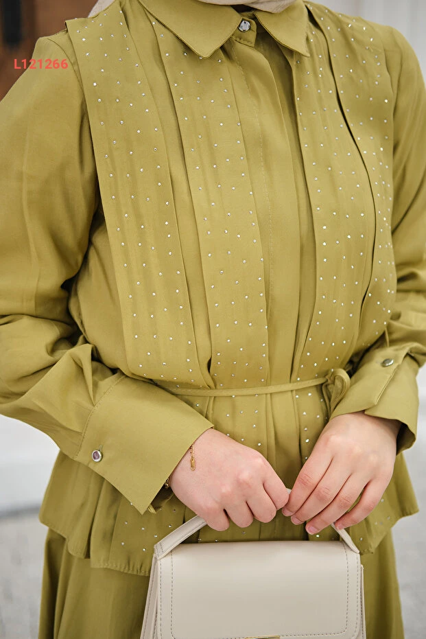طقم نسائي برباط خصر وأزرار مخفية بتفاصيل حجرية، لون زيتوني
