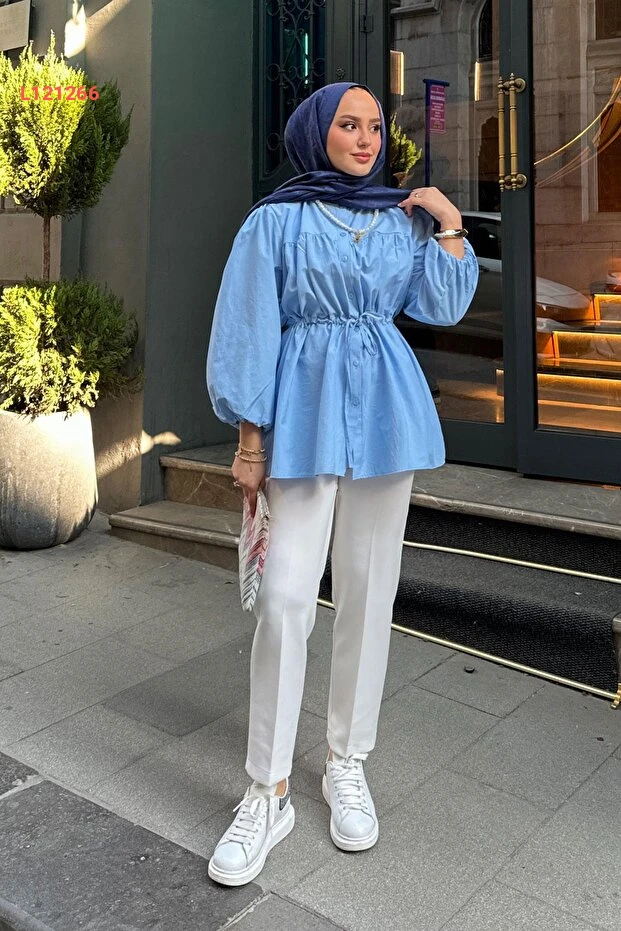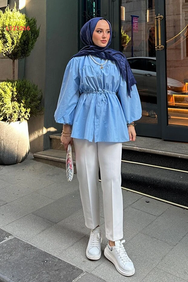 بلوزة نسائية ذات أكمام بالون وتفاصيل ضاغطة من لوكو - زرقاء