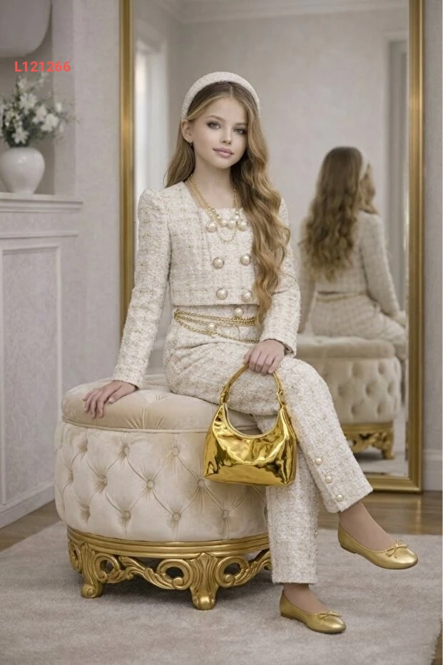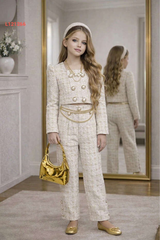 بدلة العيد المتكاملة للفتيات - سترة، بنطلون، حقيبة، تاج، عقد، وحزام من قماش توفيت