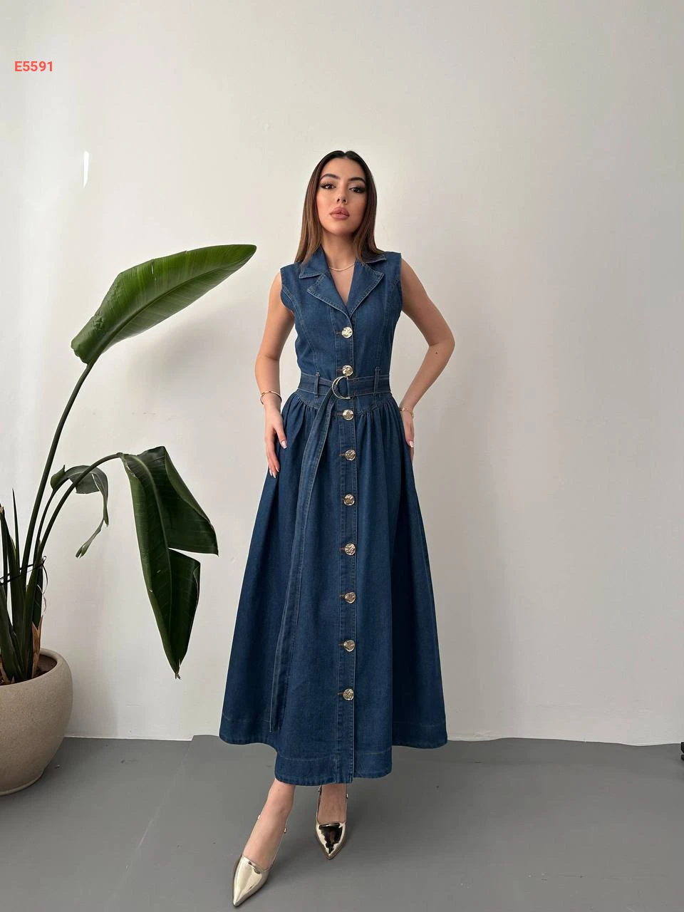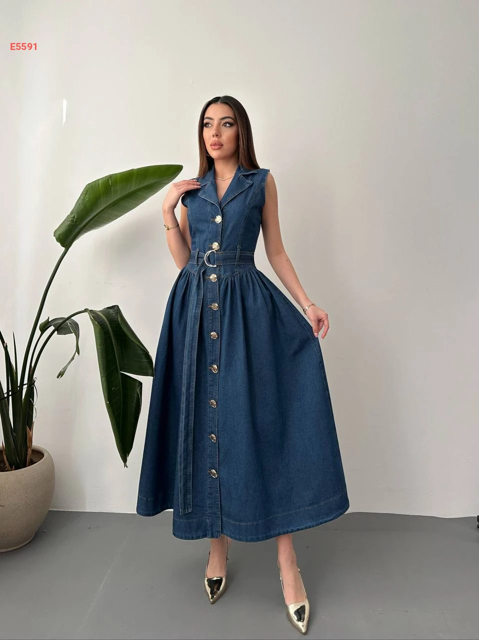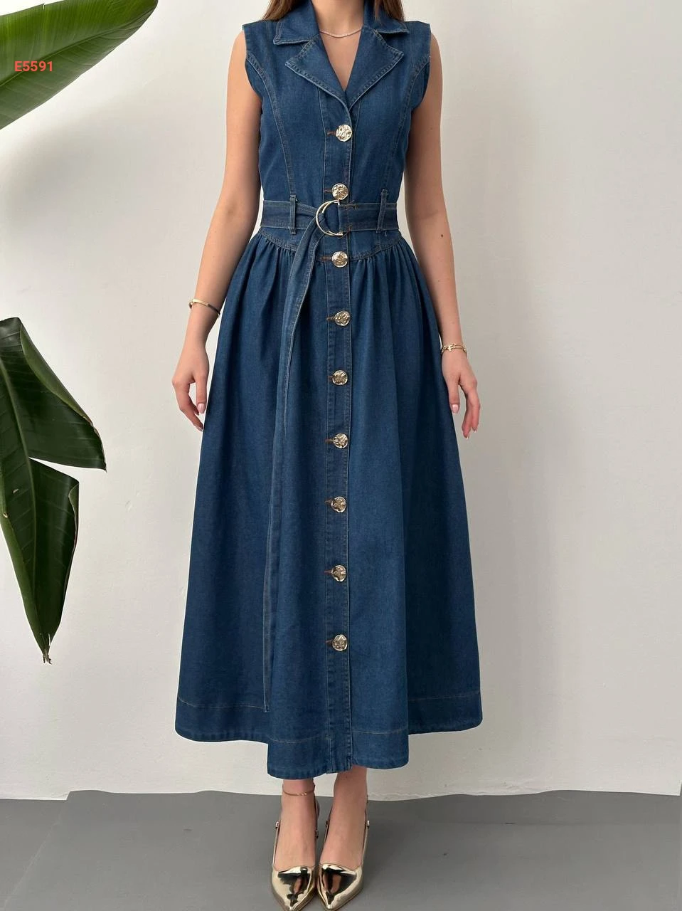 فستان جينز حفر طويل بأزرار وحزام