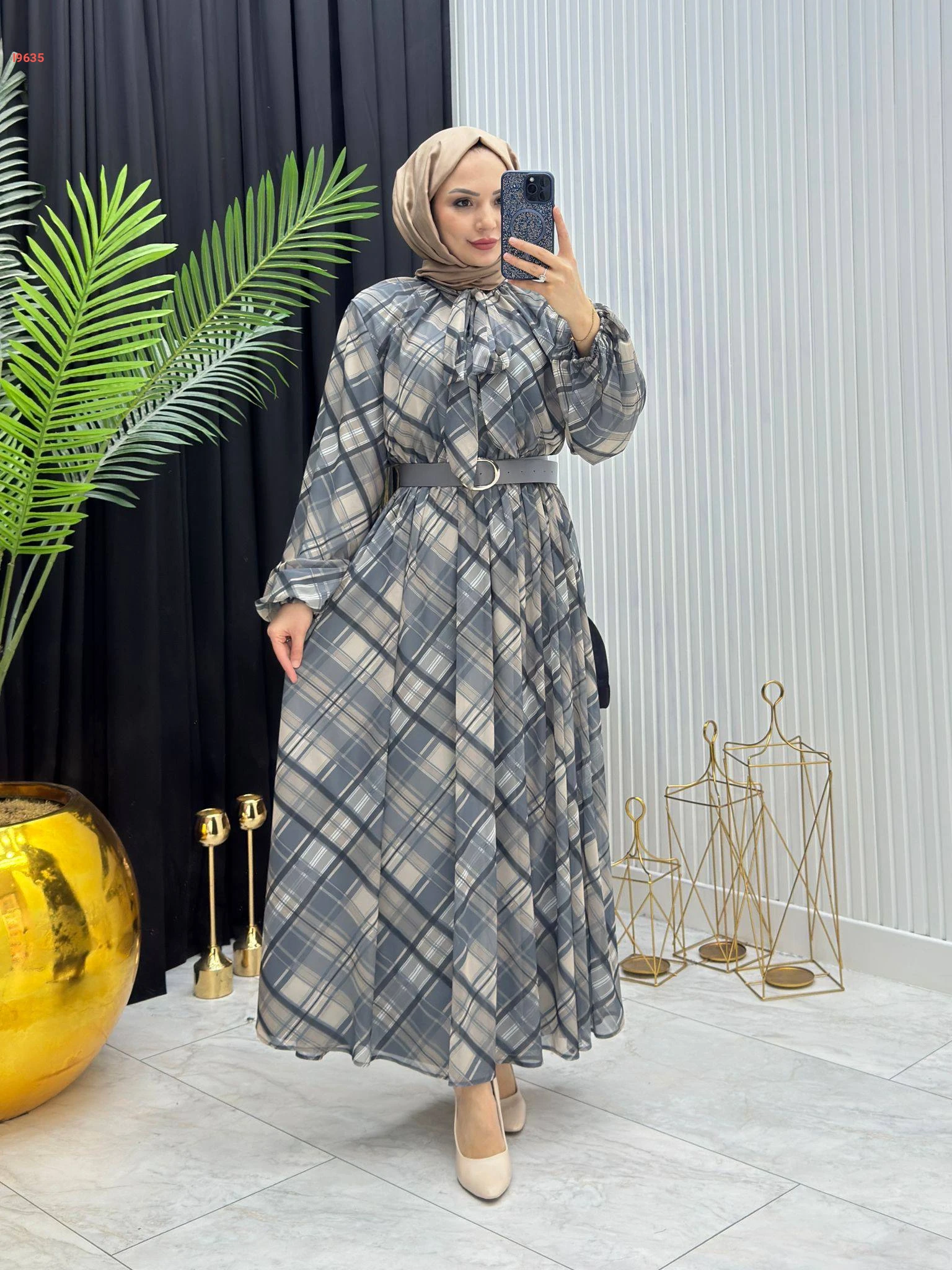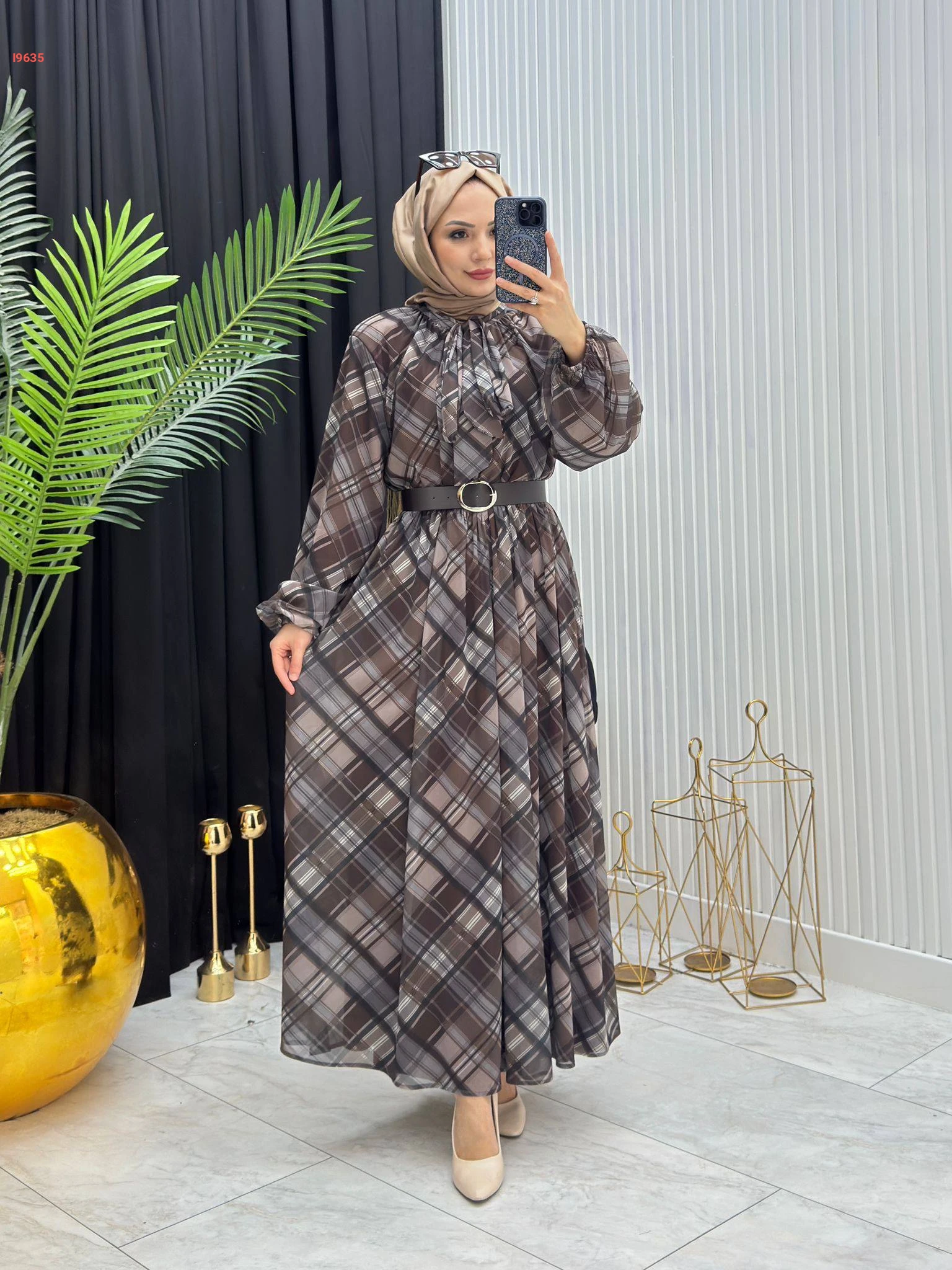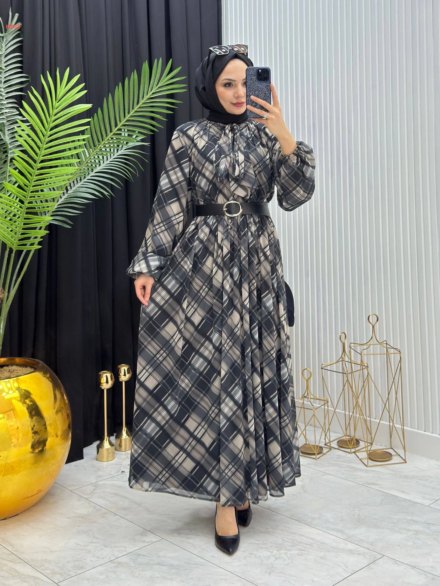 فستان طويل شيفون كارو بربطة عنق