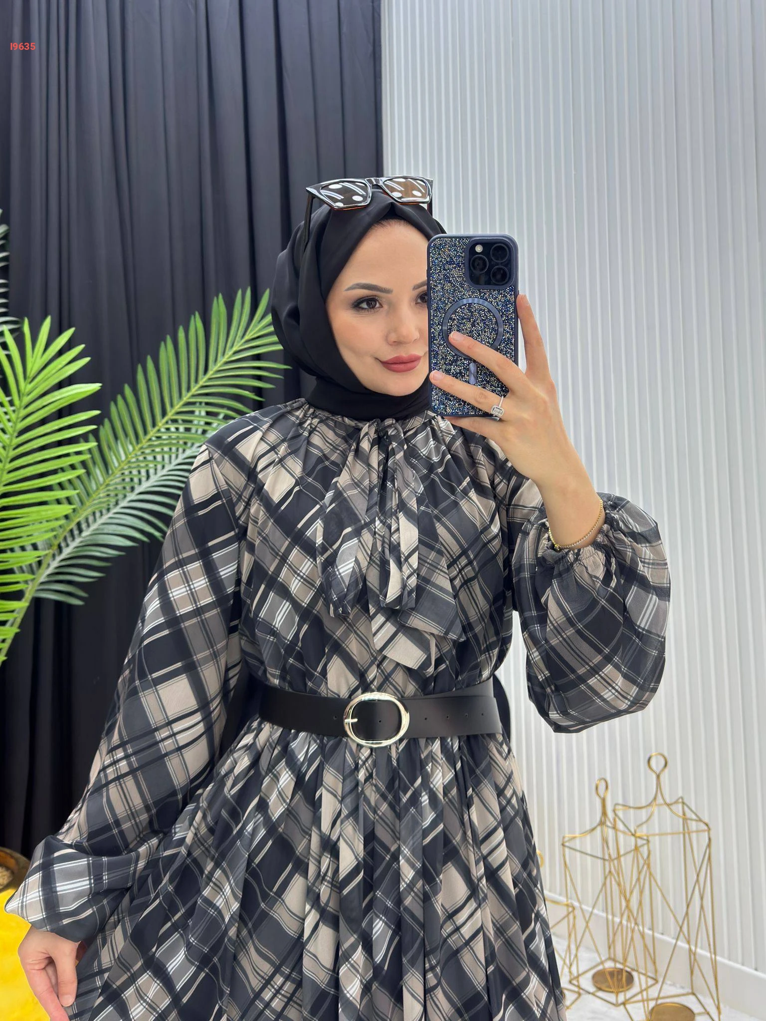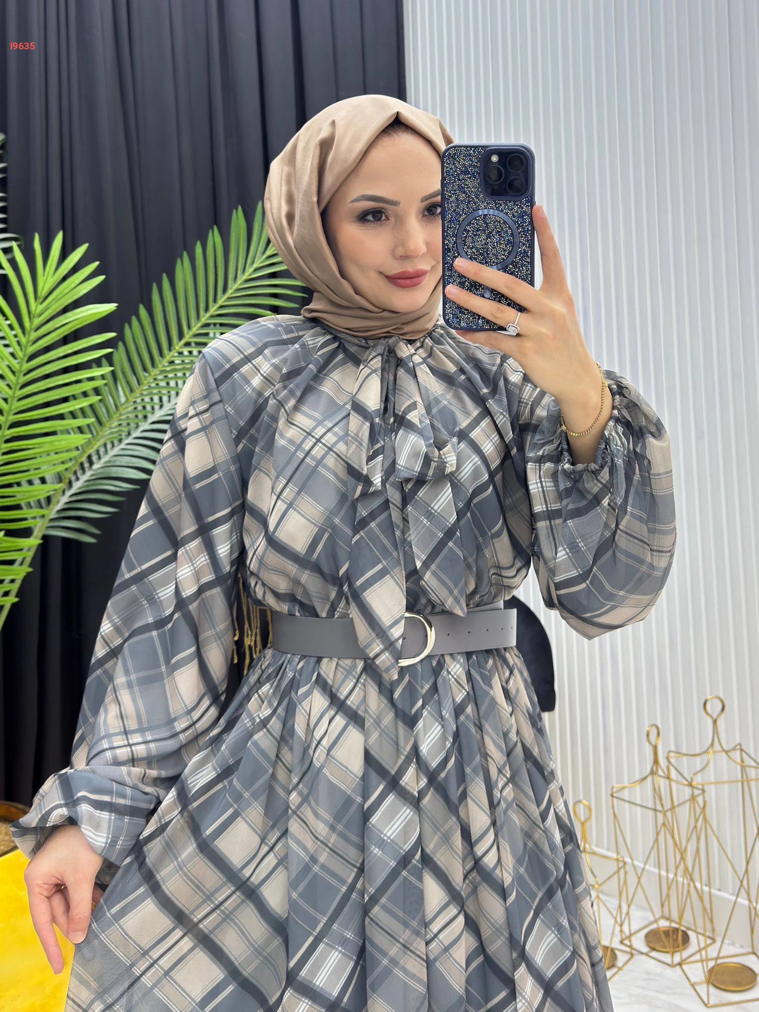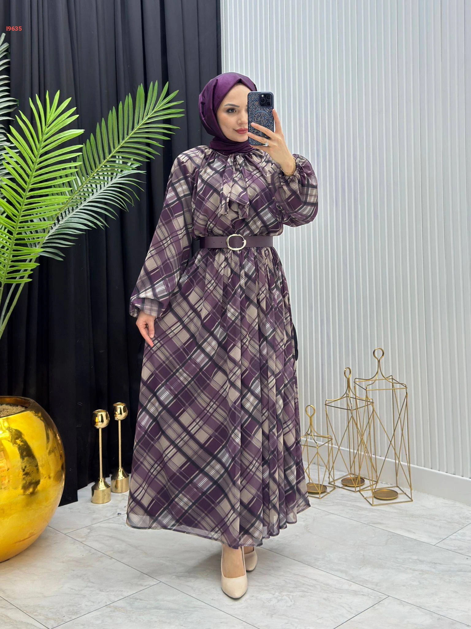 فستان طويل شيفون كارو بربطة عنق