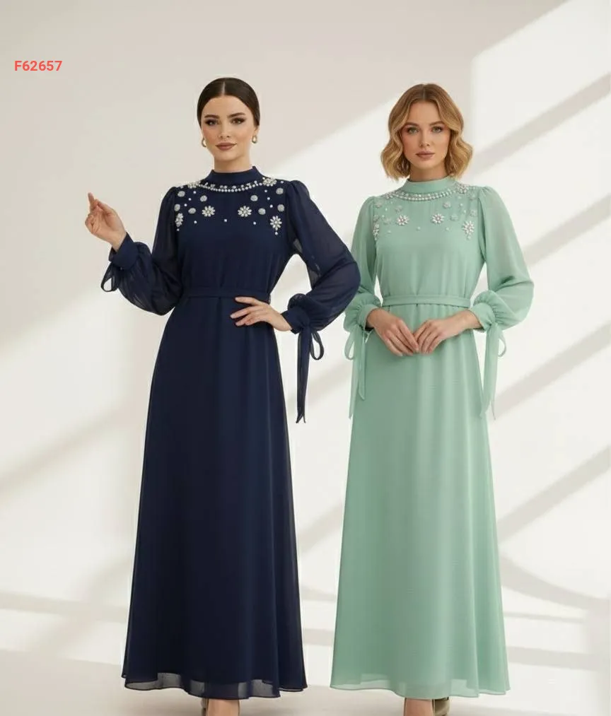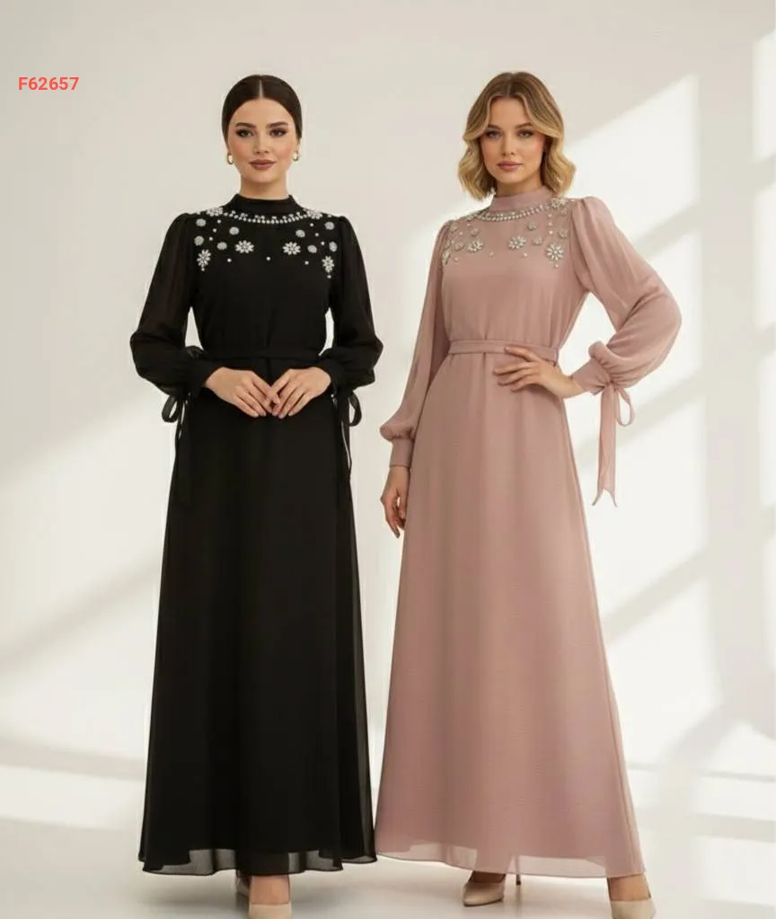 فستان شيفون طويل مزين أحجار