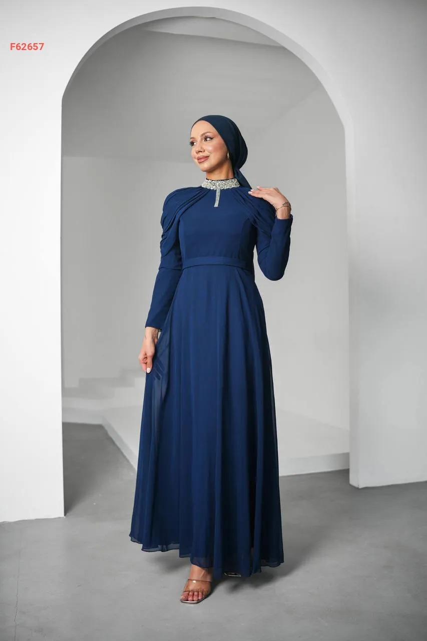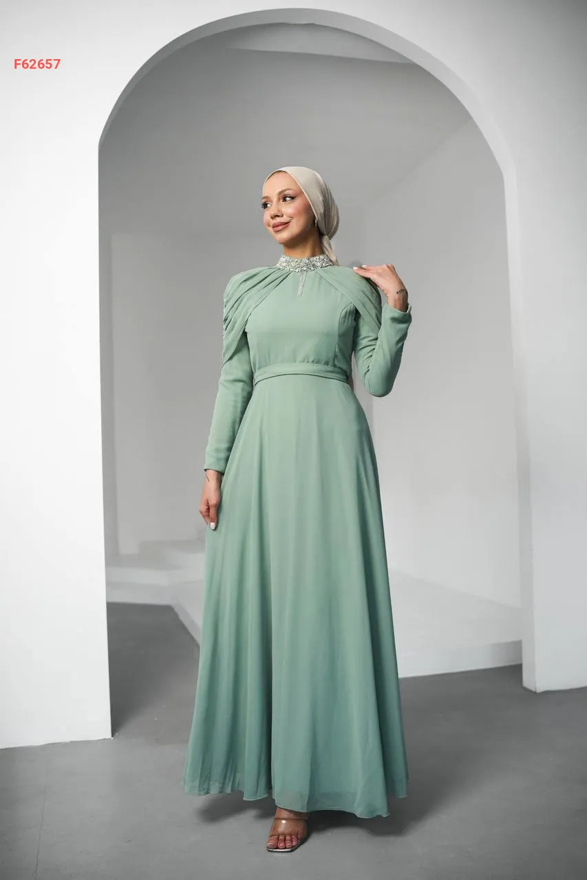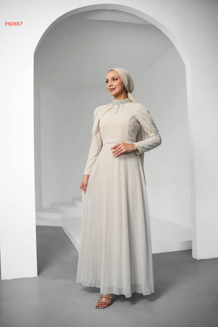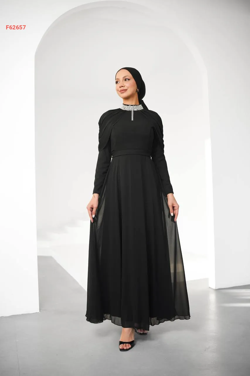 فستان طويل شيفون مبطن مزين أحجار