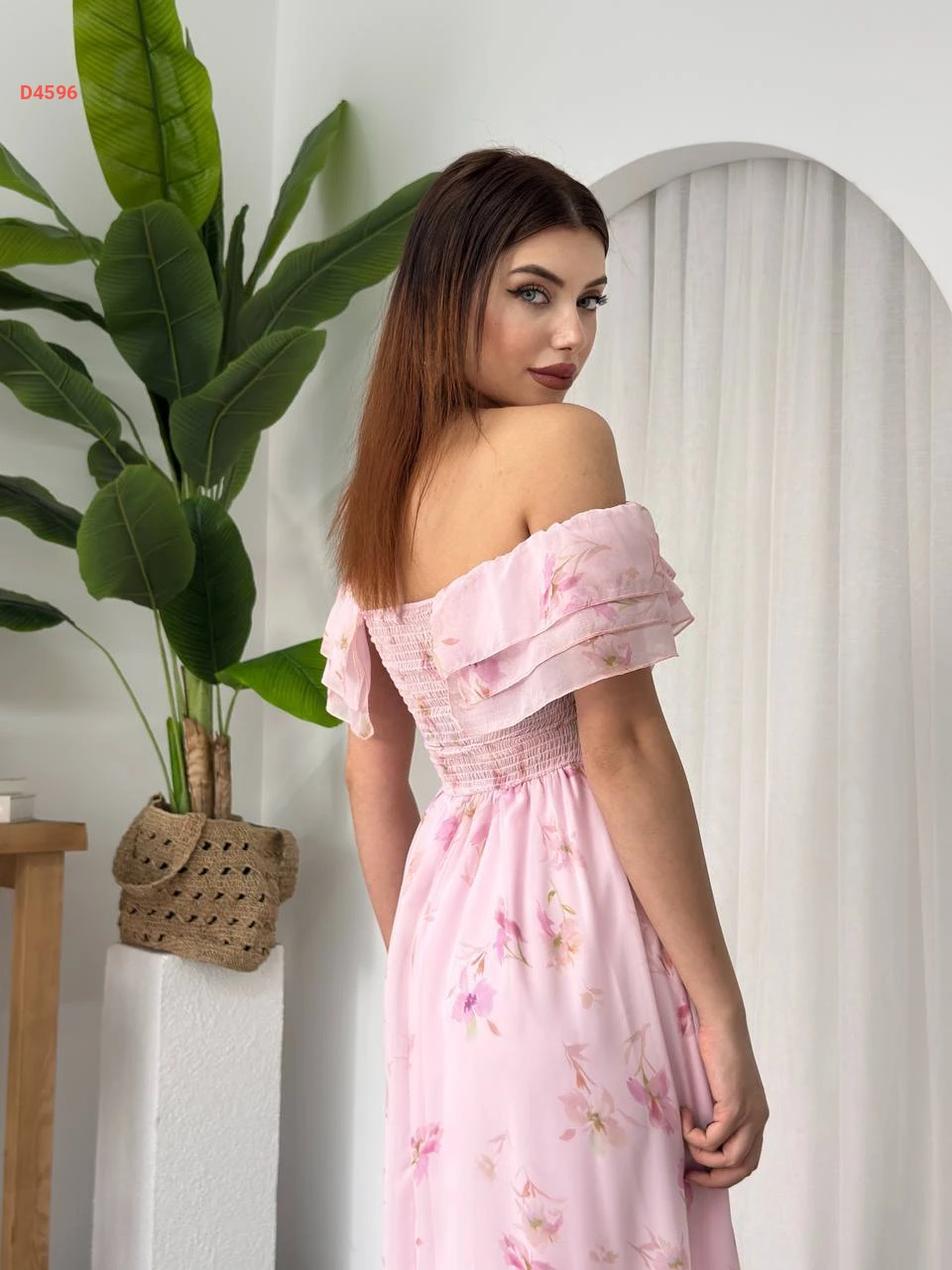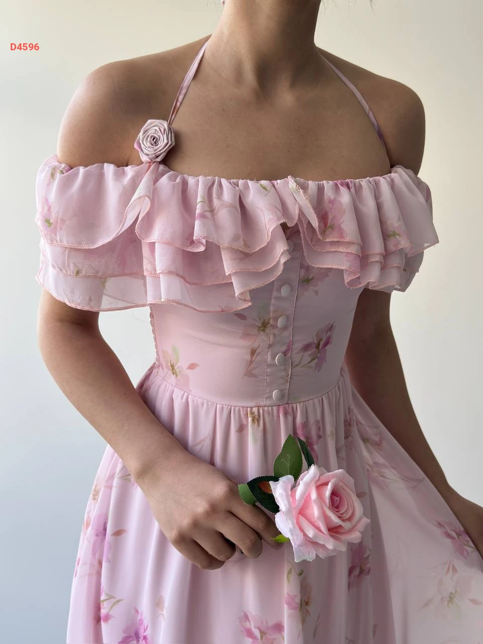 فستان طويل شيفون مورد بياقة مكشكشة