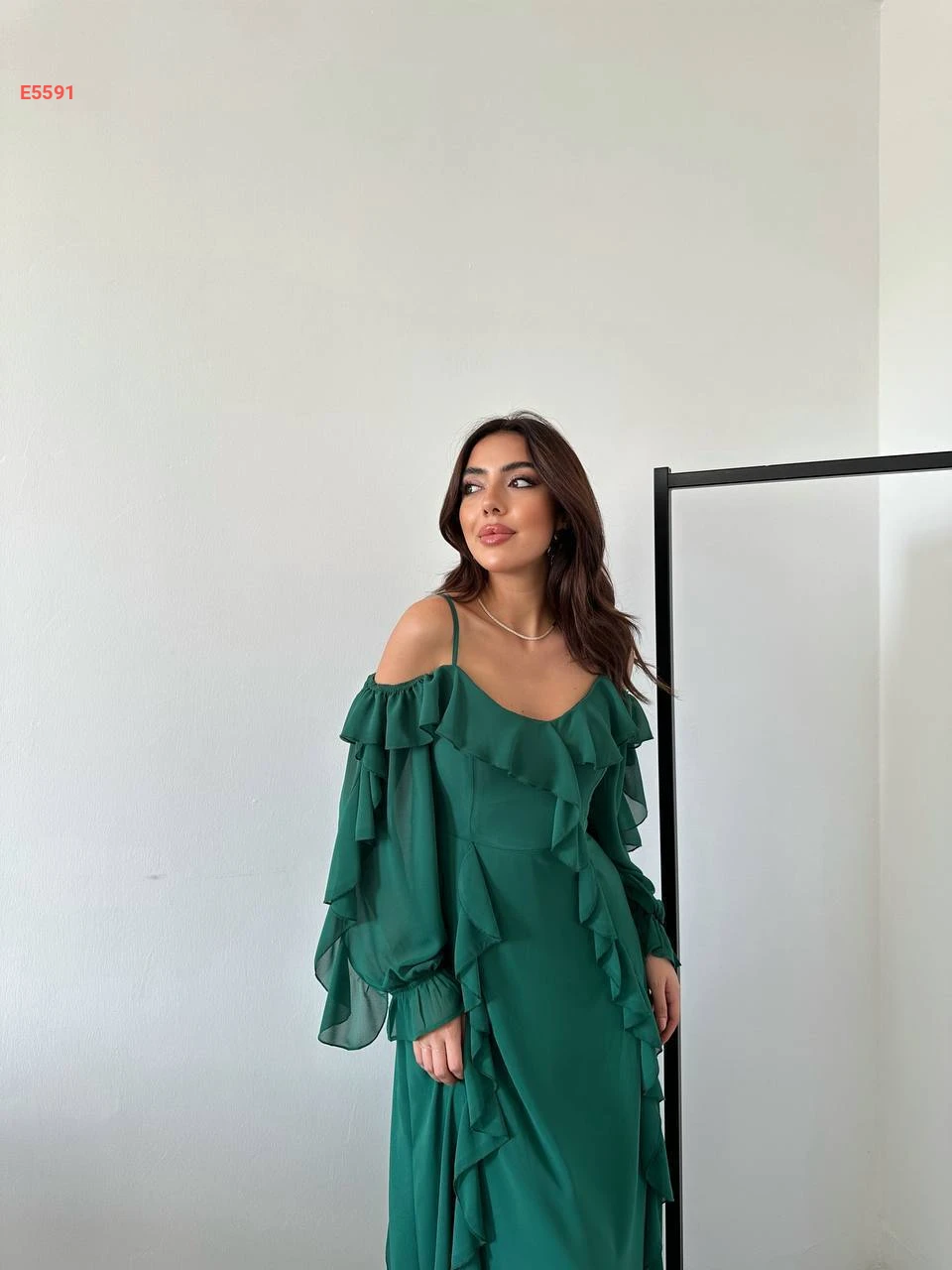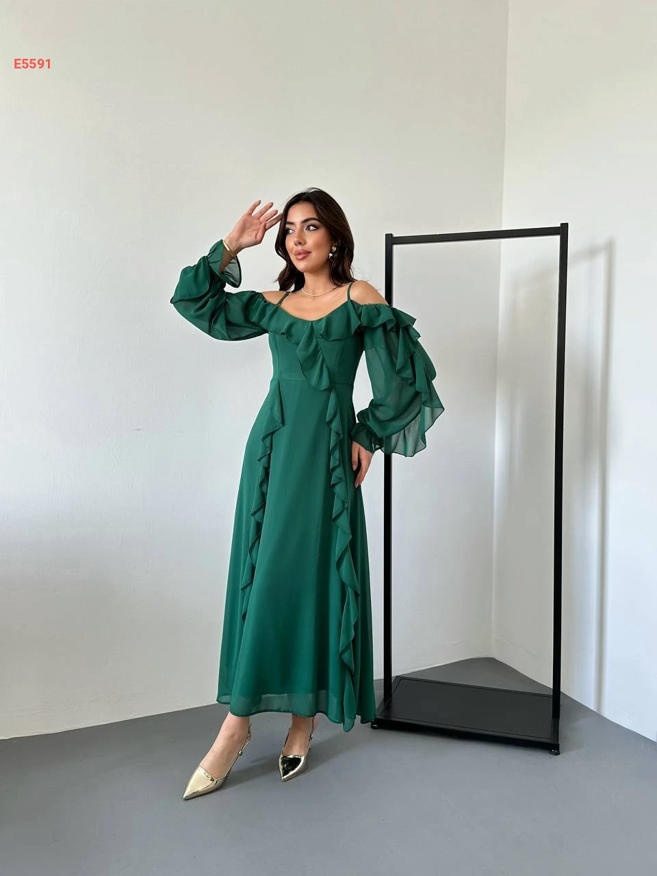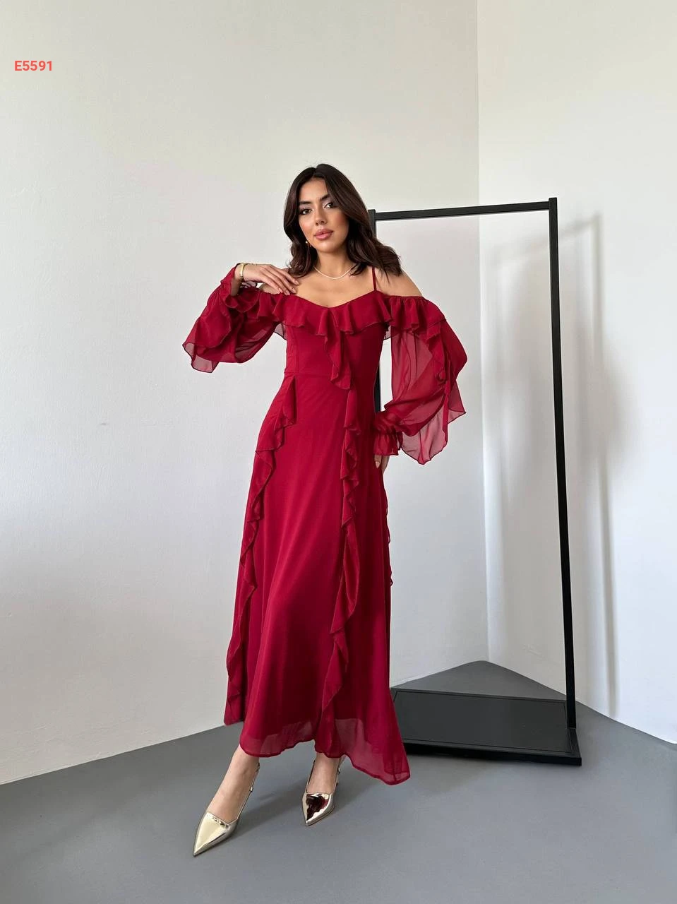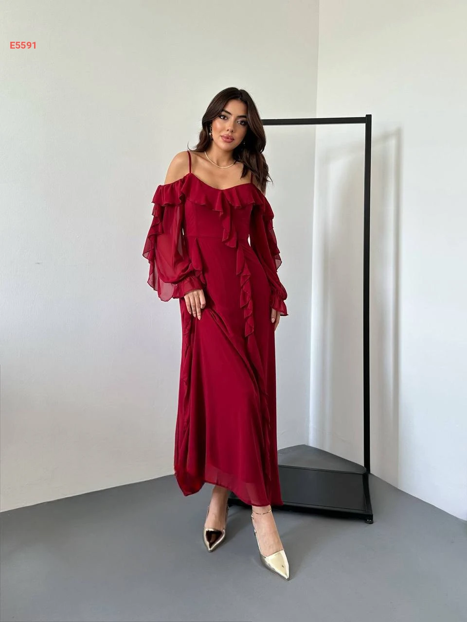 فستان طويل شيفون بتفاصيل كشكش