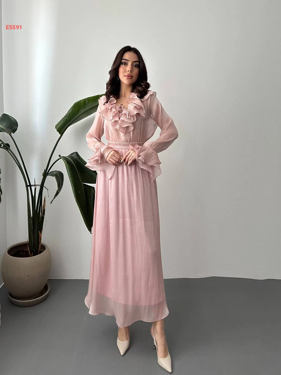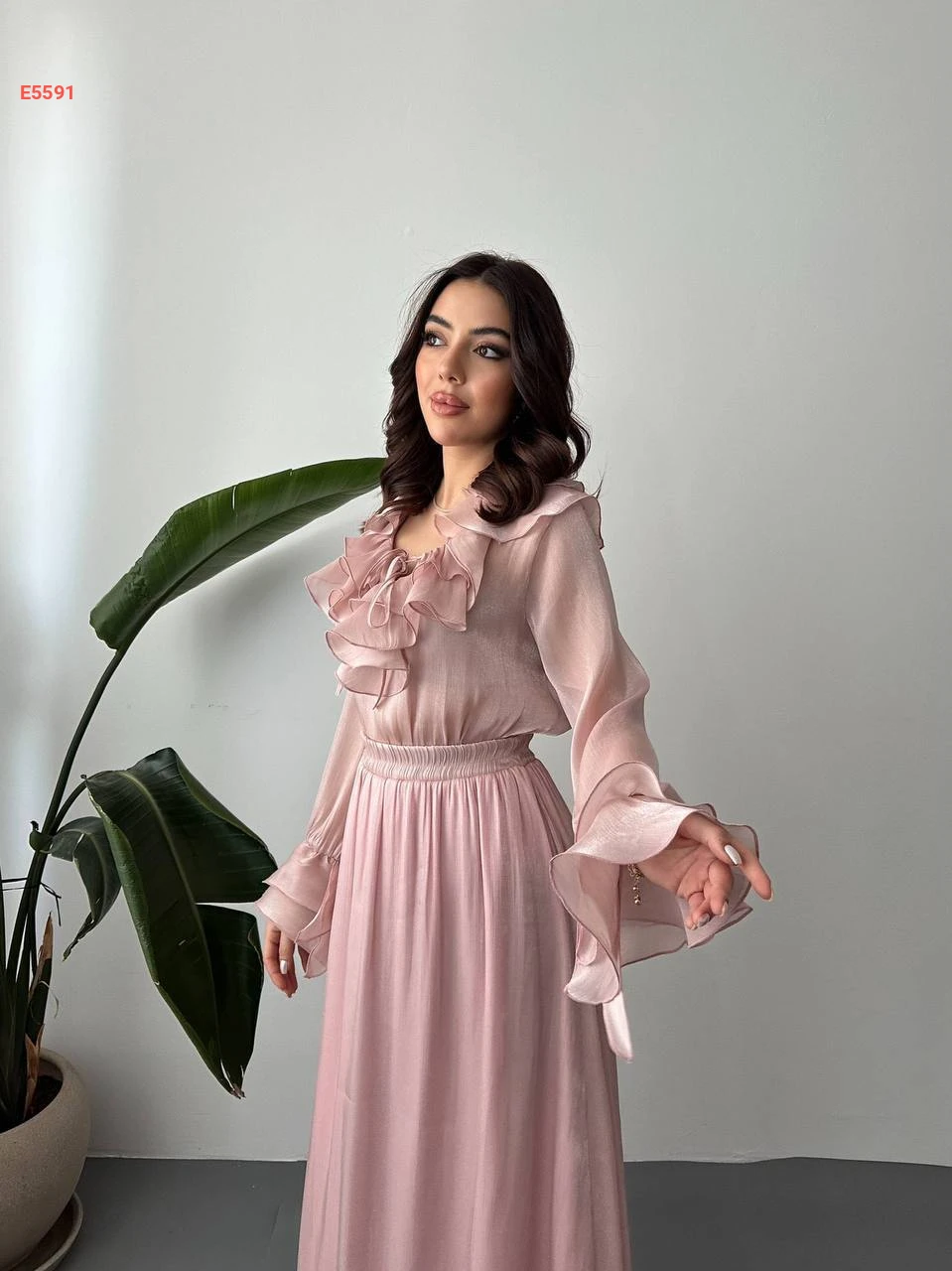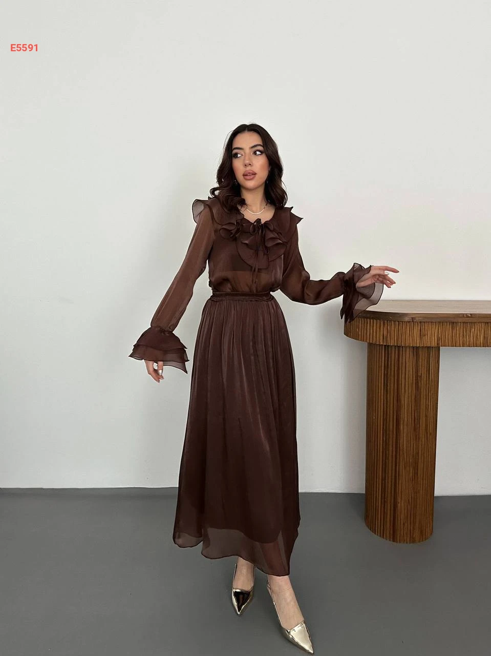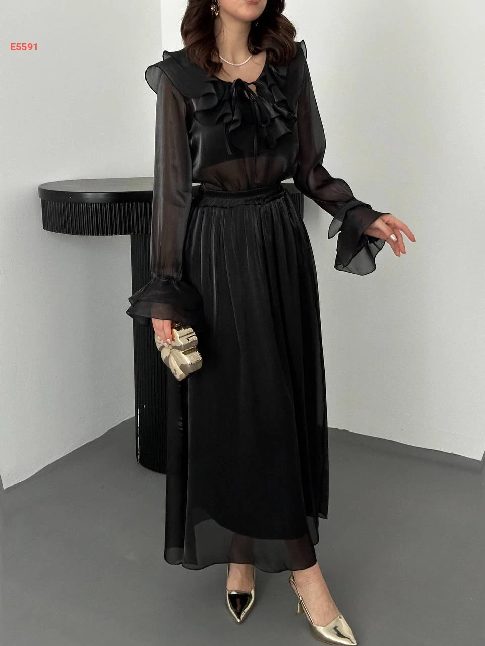 طقم تنورة طويل شيفون وبلوزة كشكش