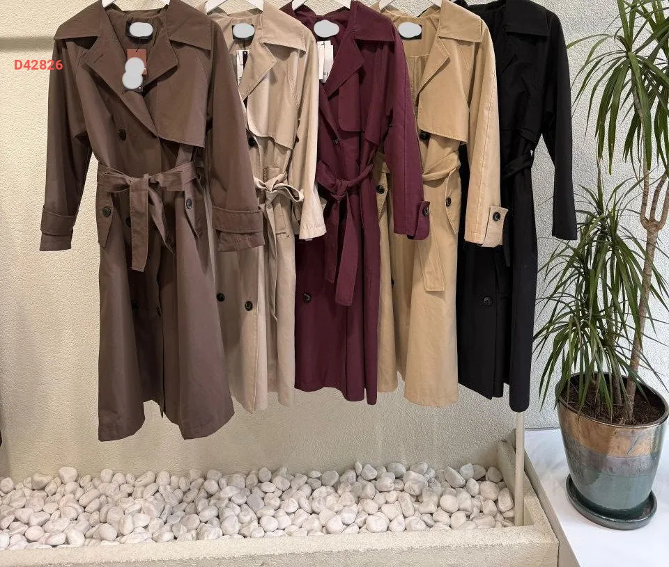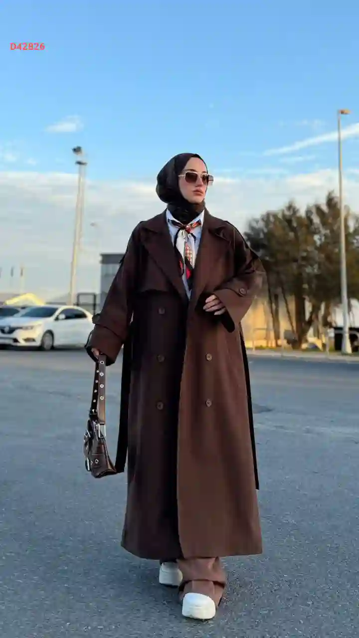 معطف طويل مزدوج الصدر بأزرار مع حزام