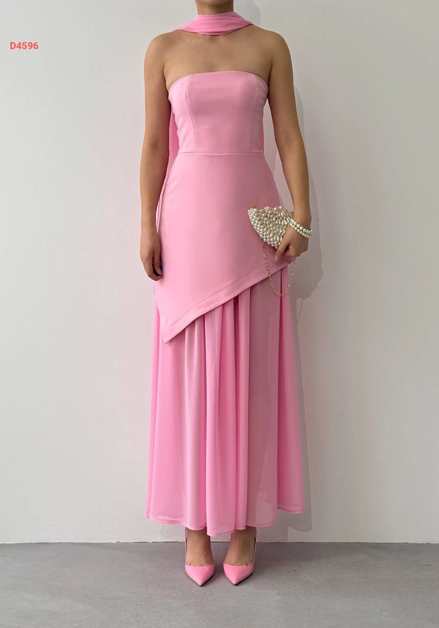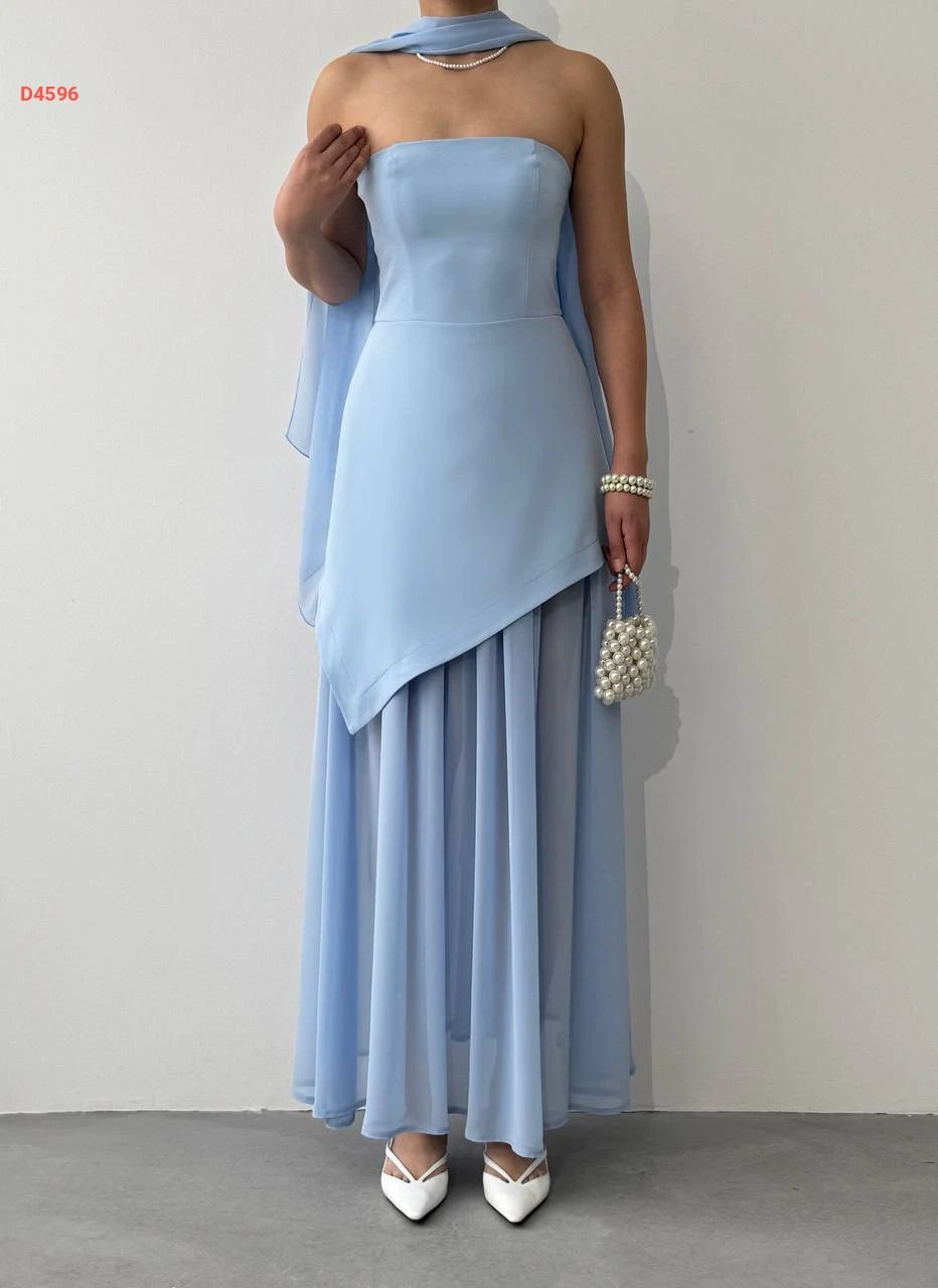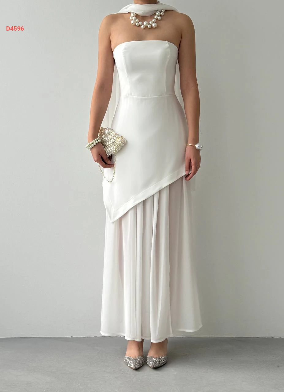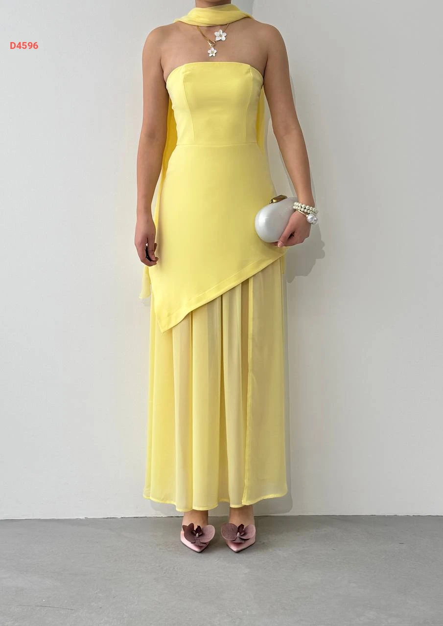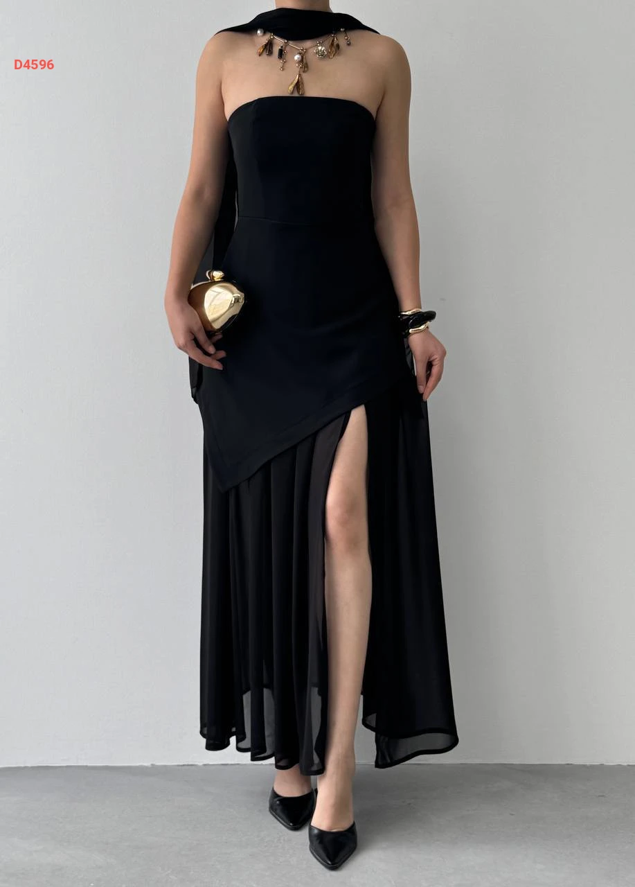 فستان طويل cut بتفاصيل شيفون ووشاح
