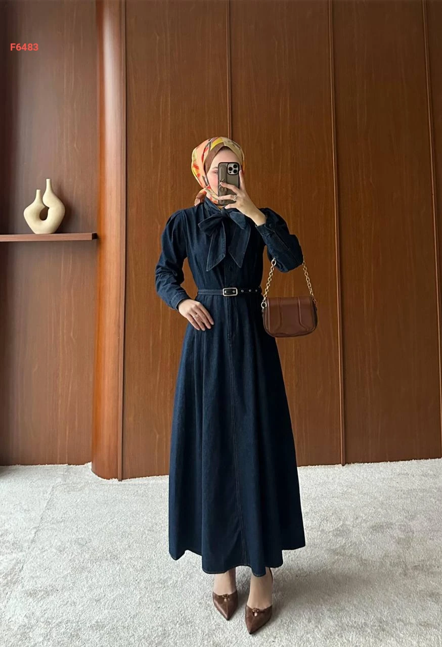 فستان جينز طويل بحزام وربطة عنق