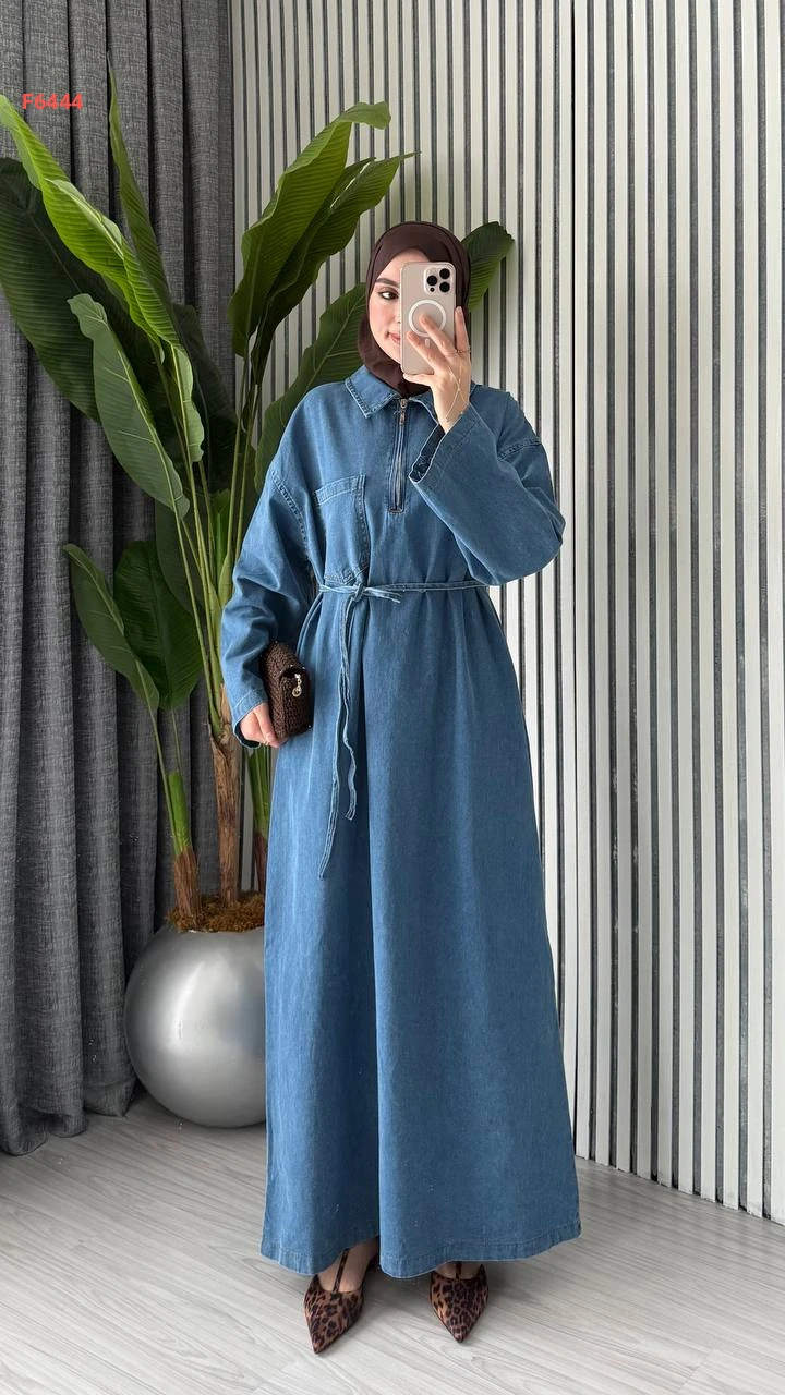فستان جينز طويل قبة بولو بسحاب