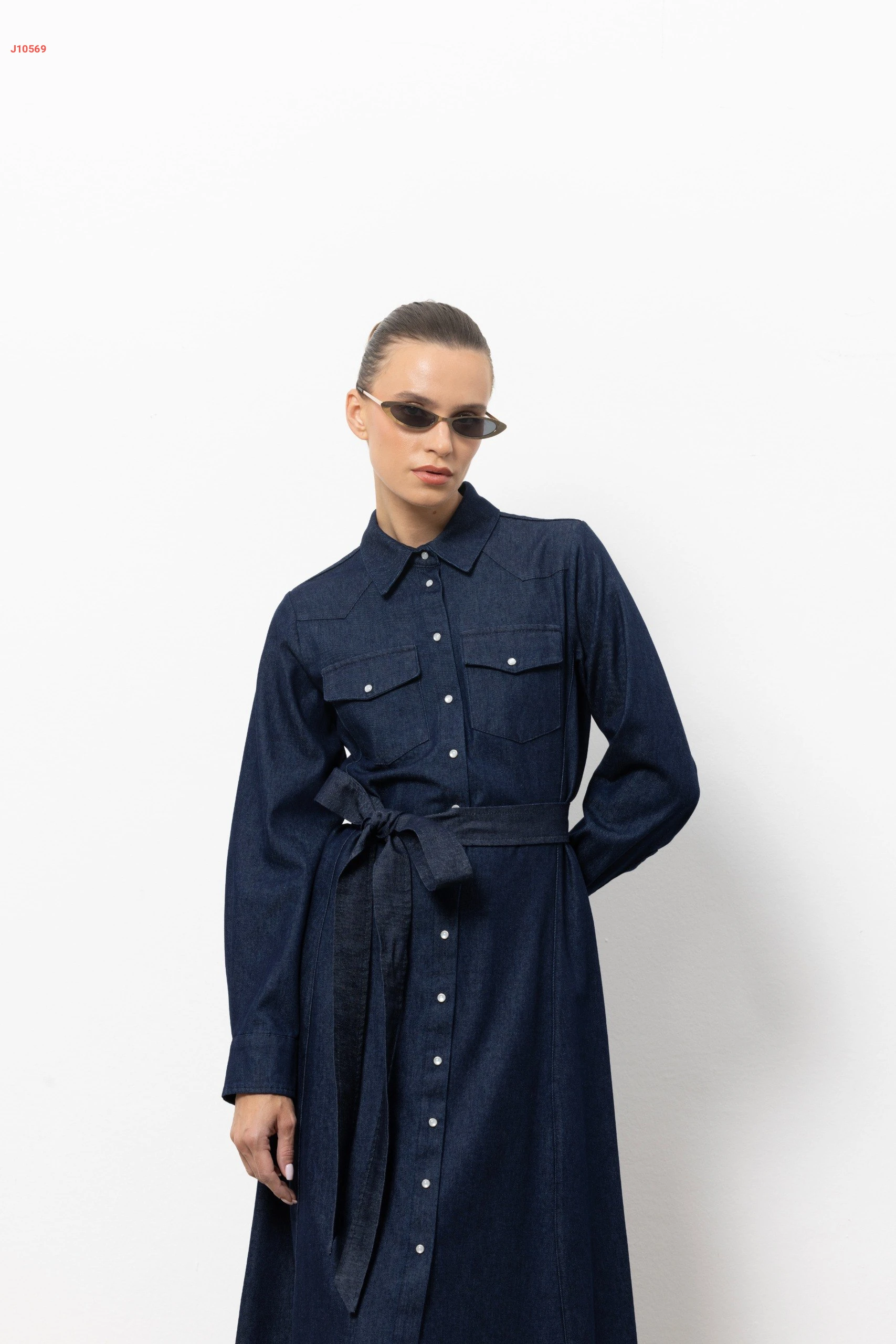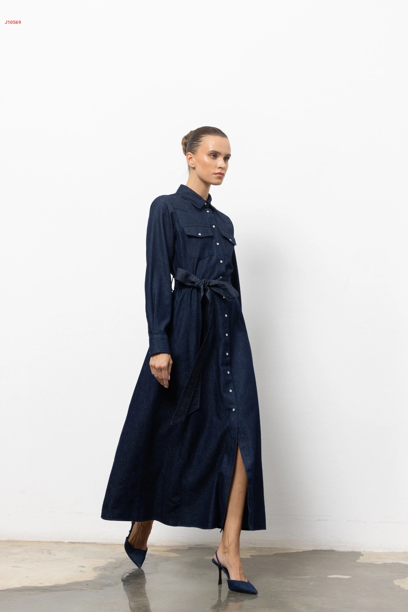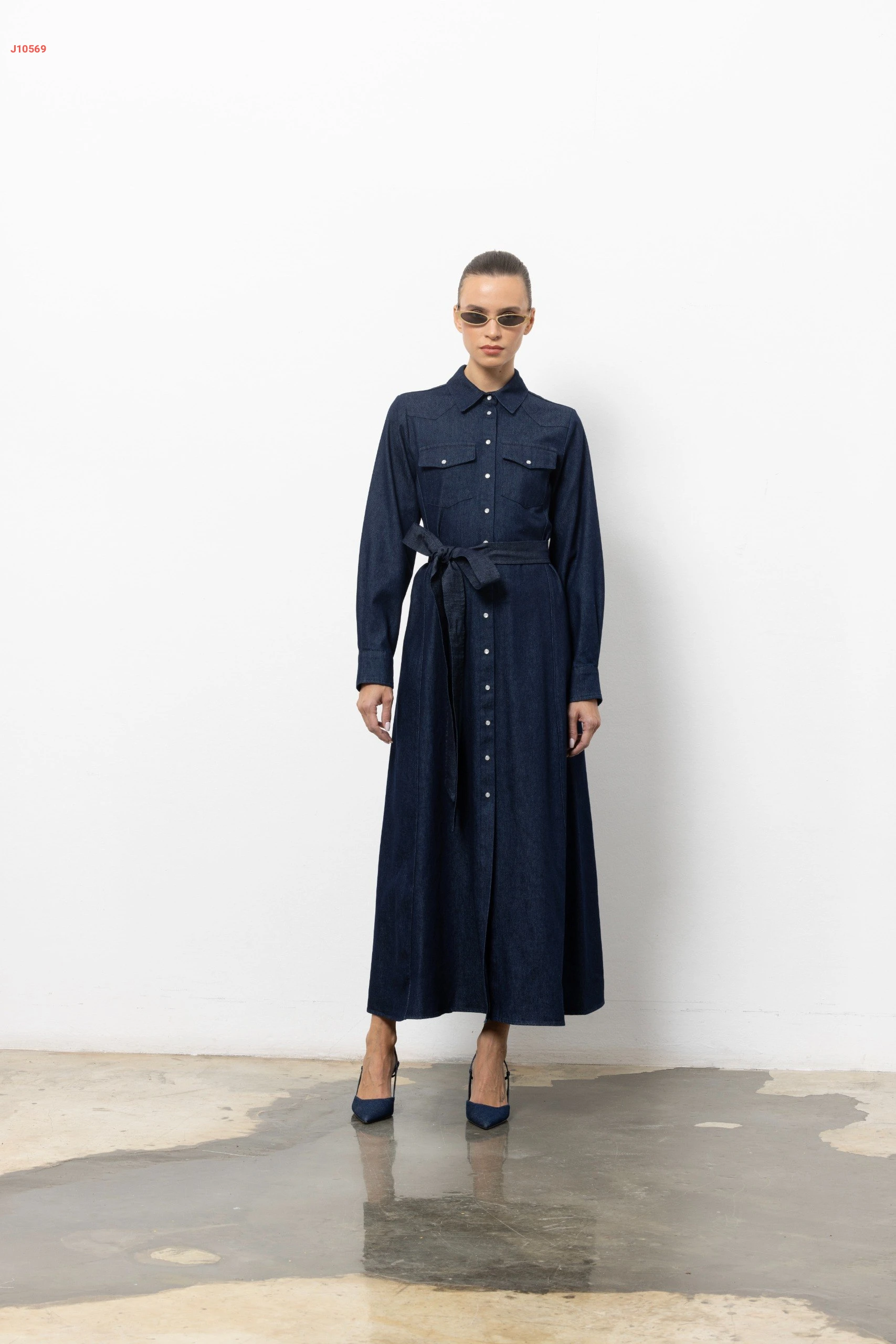 فستان جينز طويل بأزرار وزنار