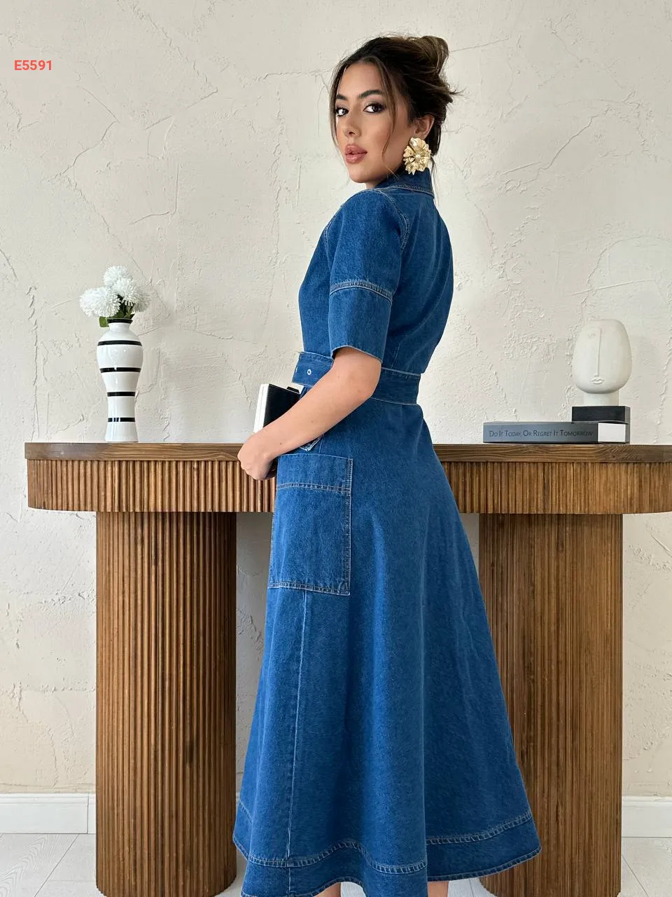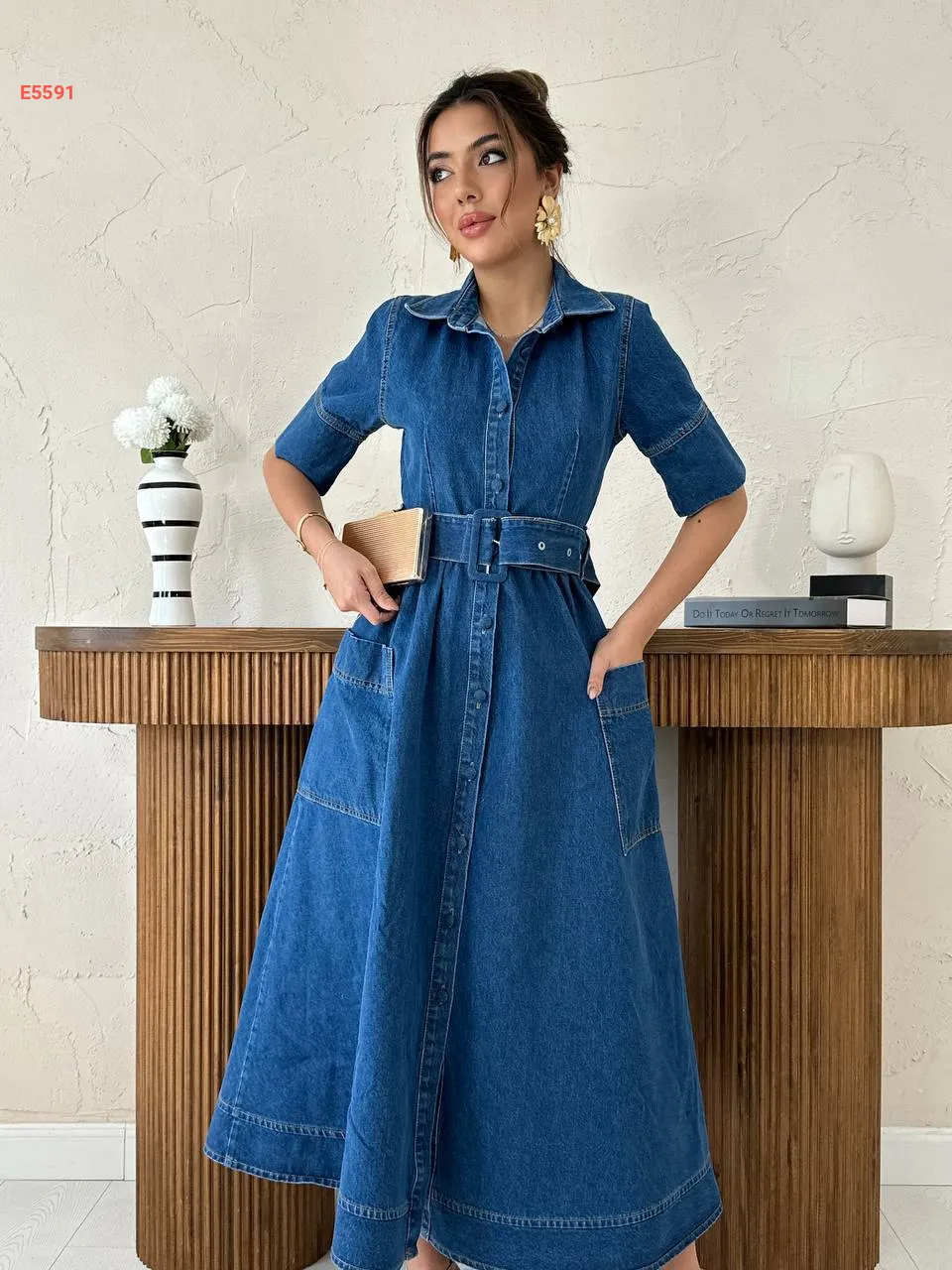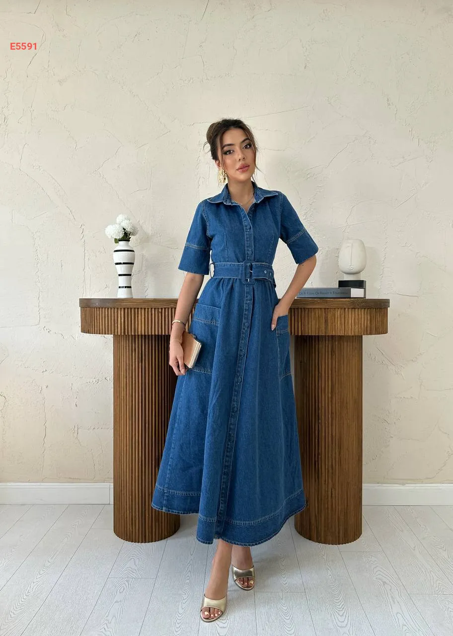 فستان جينز طويل بأزرار وحزام