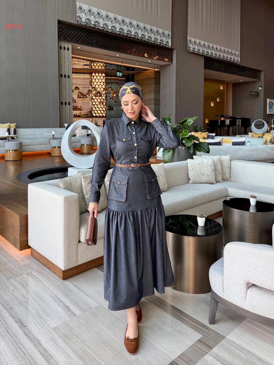 فستان جينز طويل بأزرار وجيوب