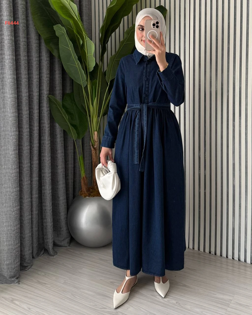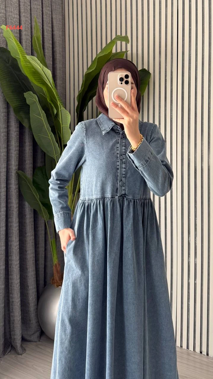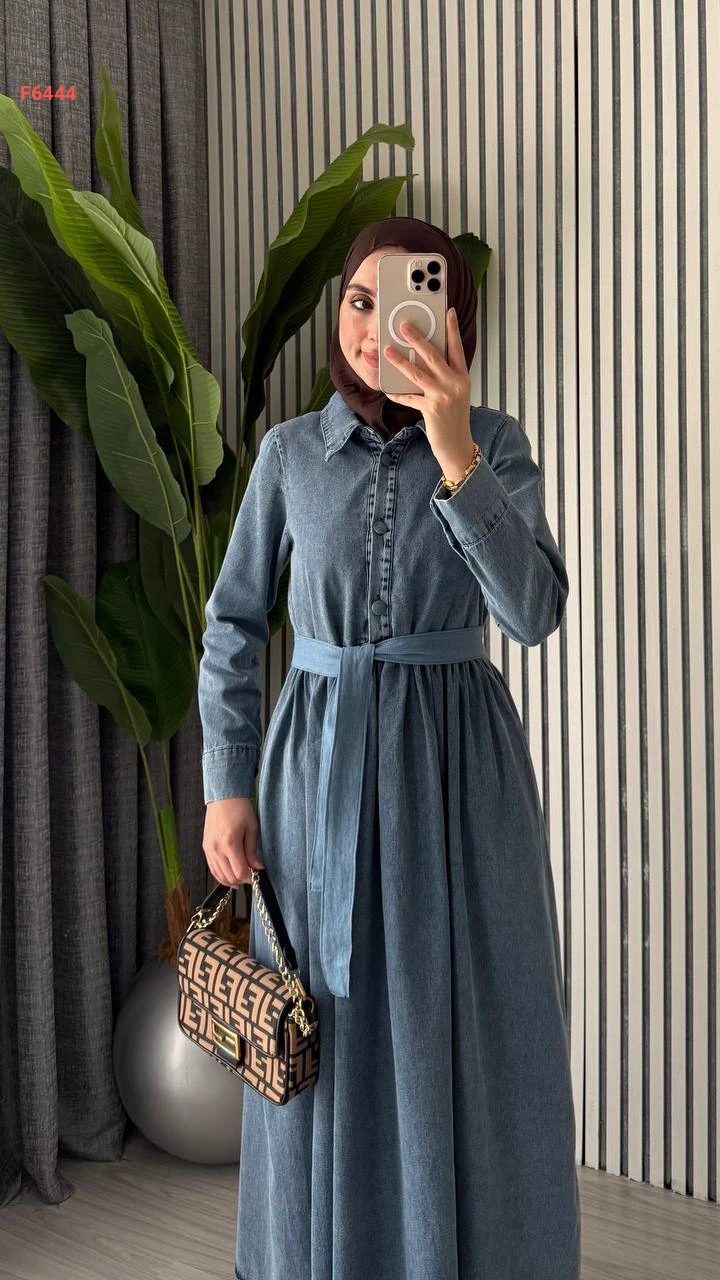 فستان جينز طويل بأزرار نصفية وزنار