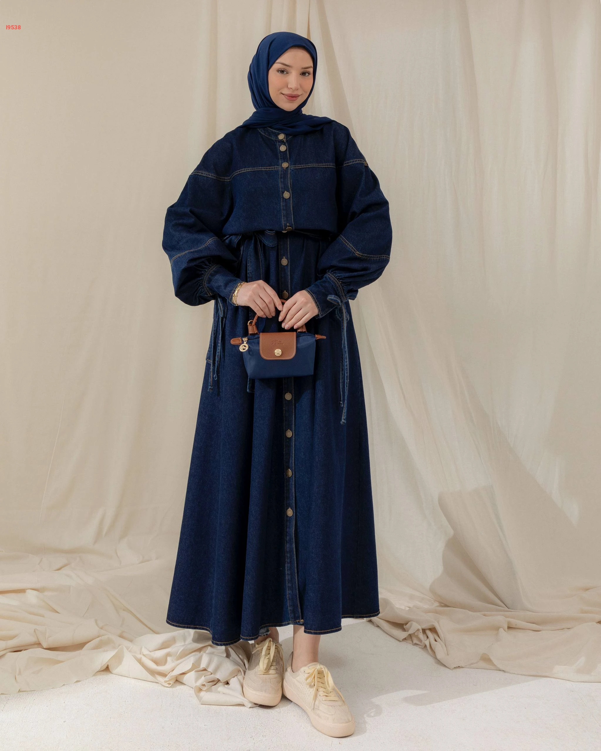 فستان جينز طويل بأكمام منفوخة وتصميم عملي بأزرار أمامية وحزام خصر