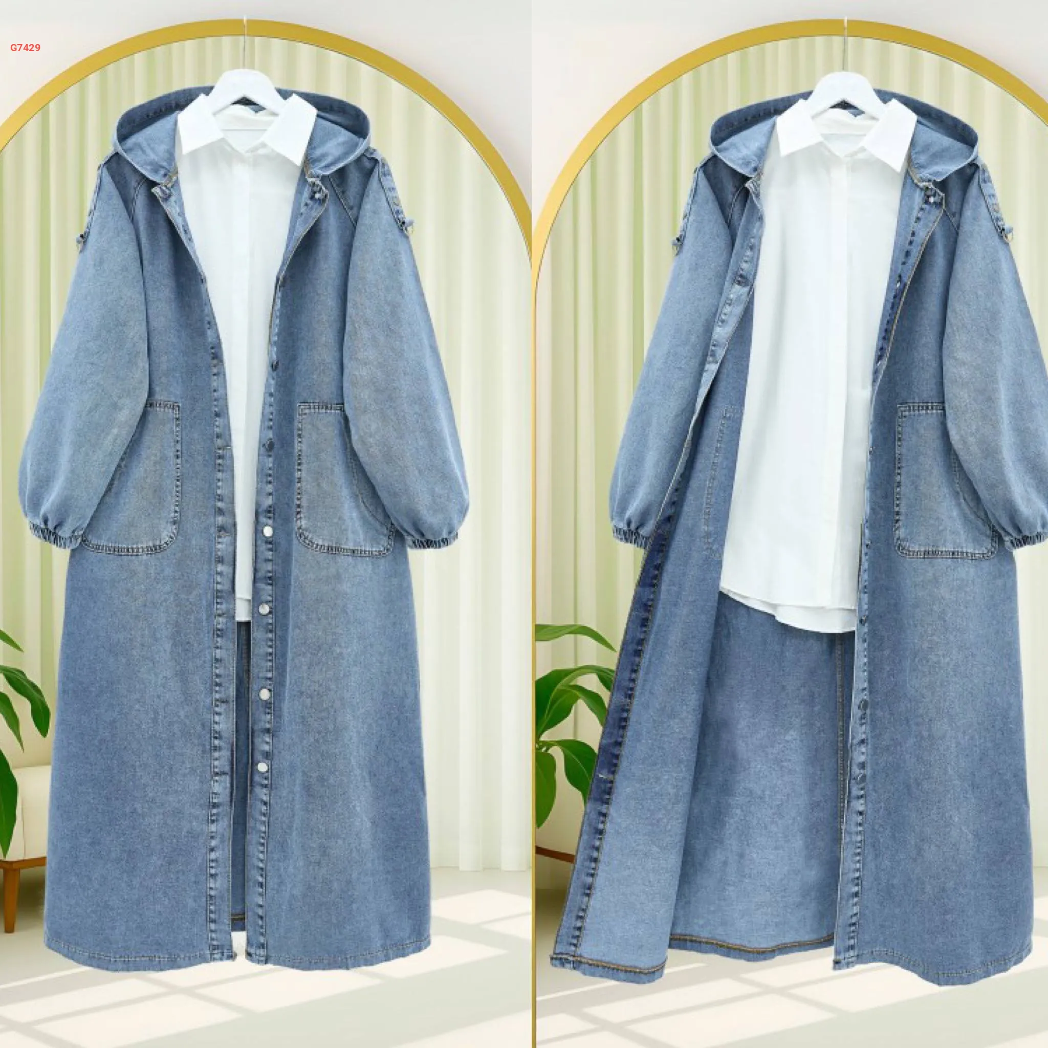 جاكيت جينز طويل بأزرار مع جيب عريضة وغطاء رأس