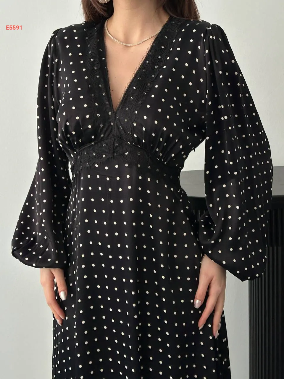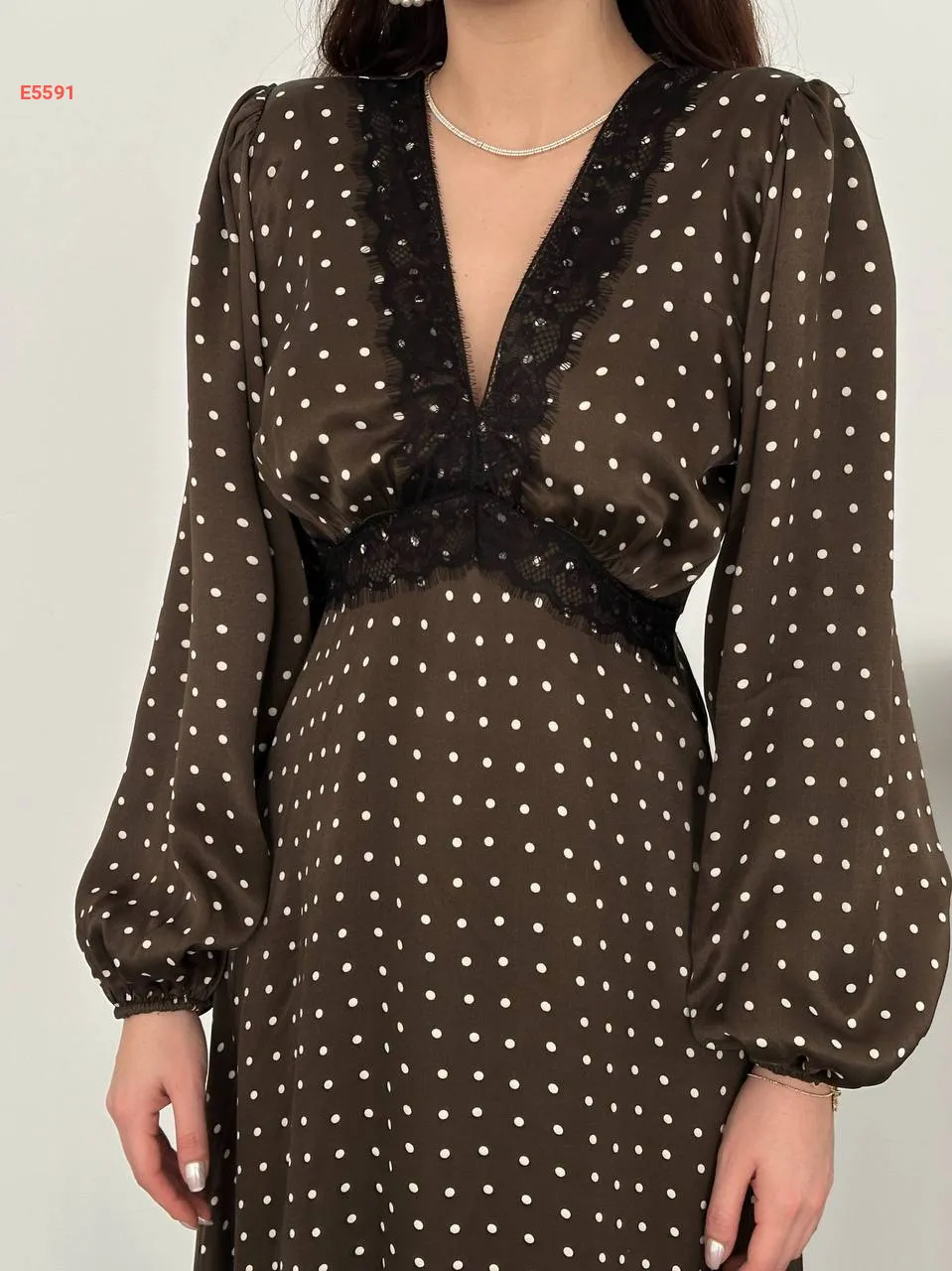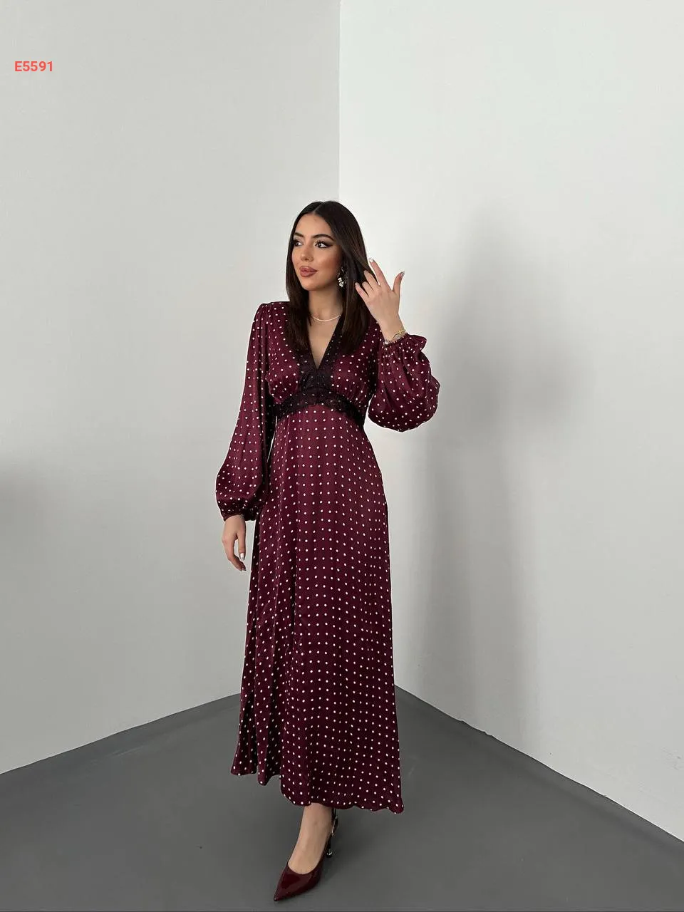 فستان طويل ساتان منقط بدانتيل عالقبة