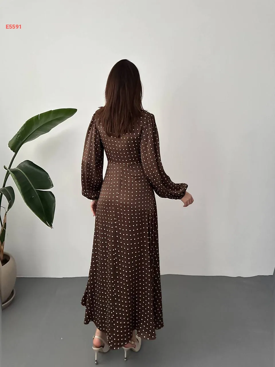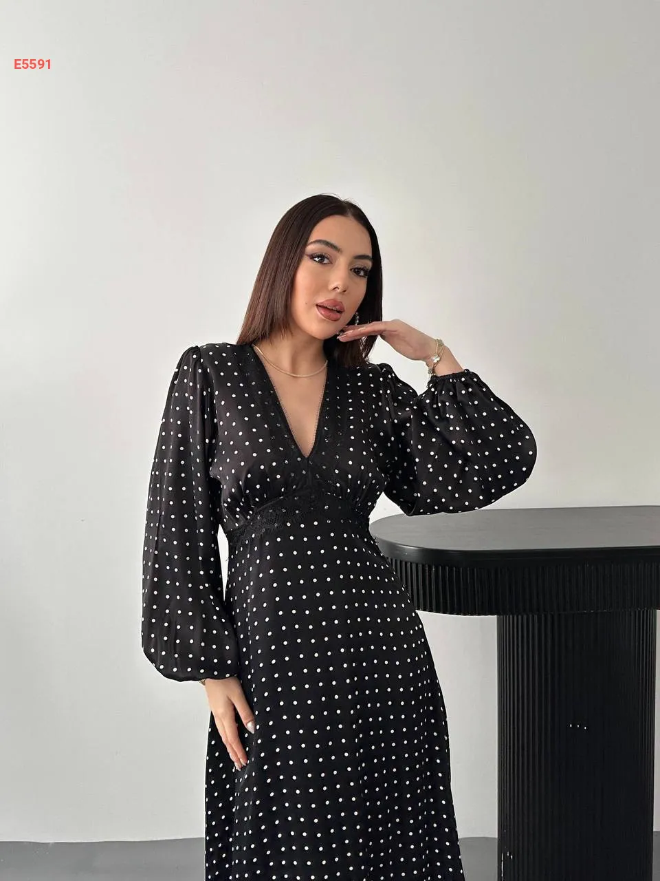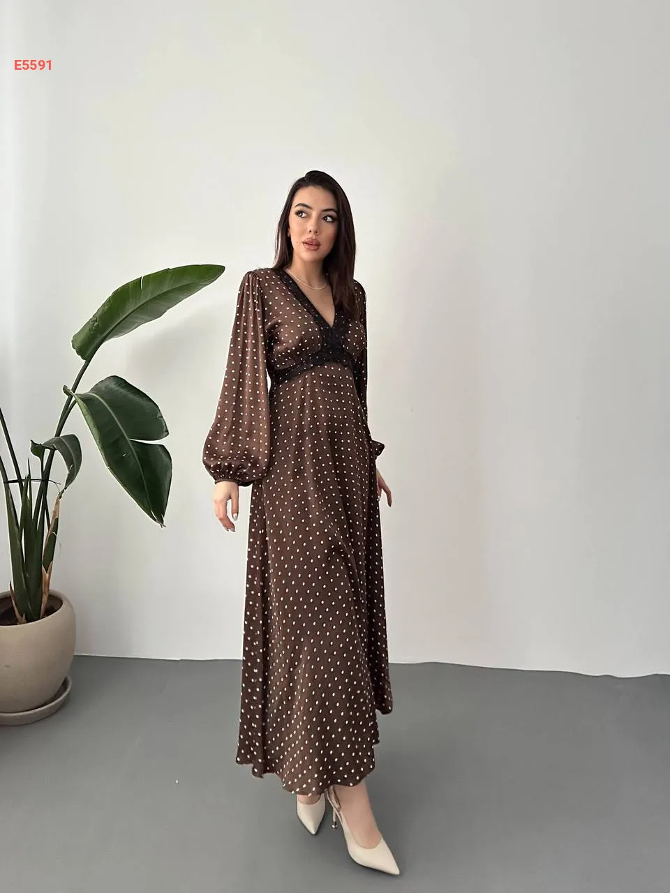 فستان طويل ساتان منقط بدانتيل عالقبة