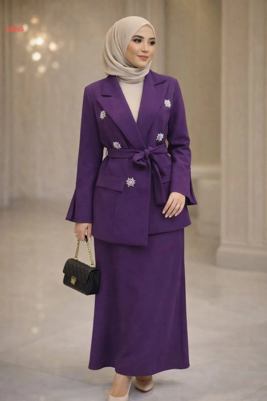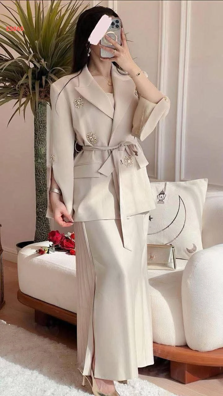 طقم تنورة طويل دبل مع جاكيت بأحجار
