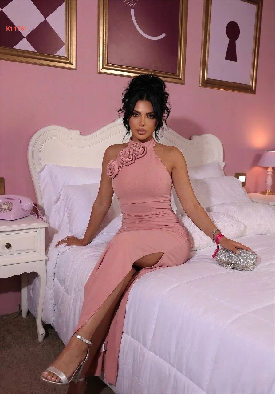 فستان طويل مزين ورد بفتحة جانبية