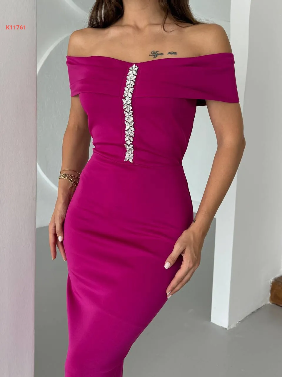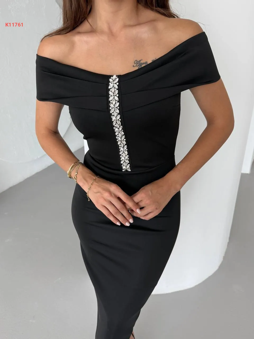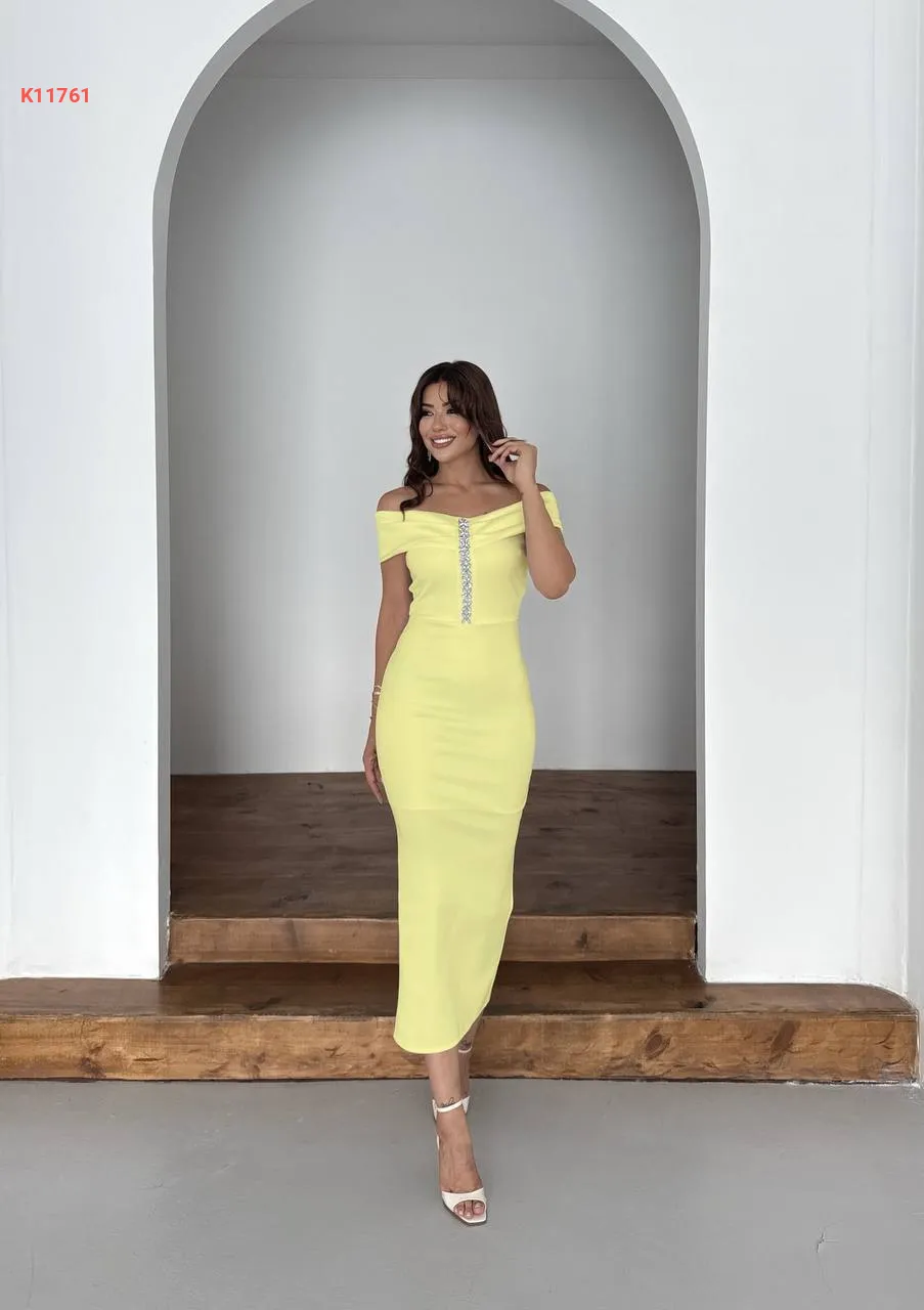 فستان طويل مزين أحجار بياقة مادونا