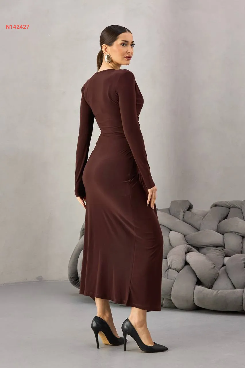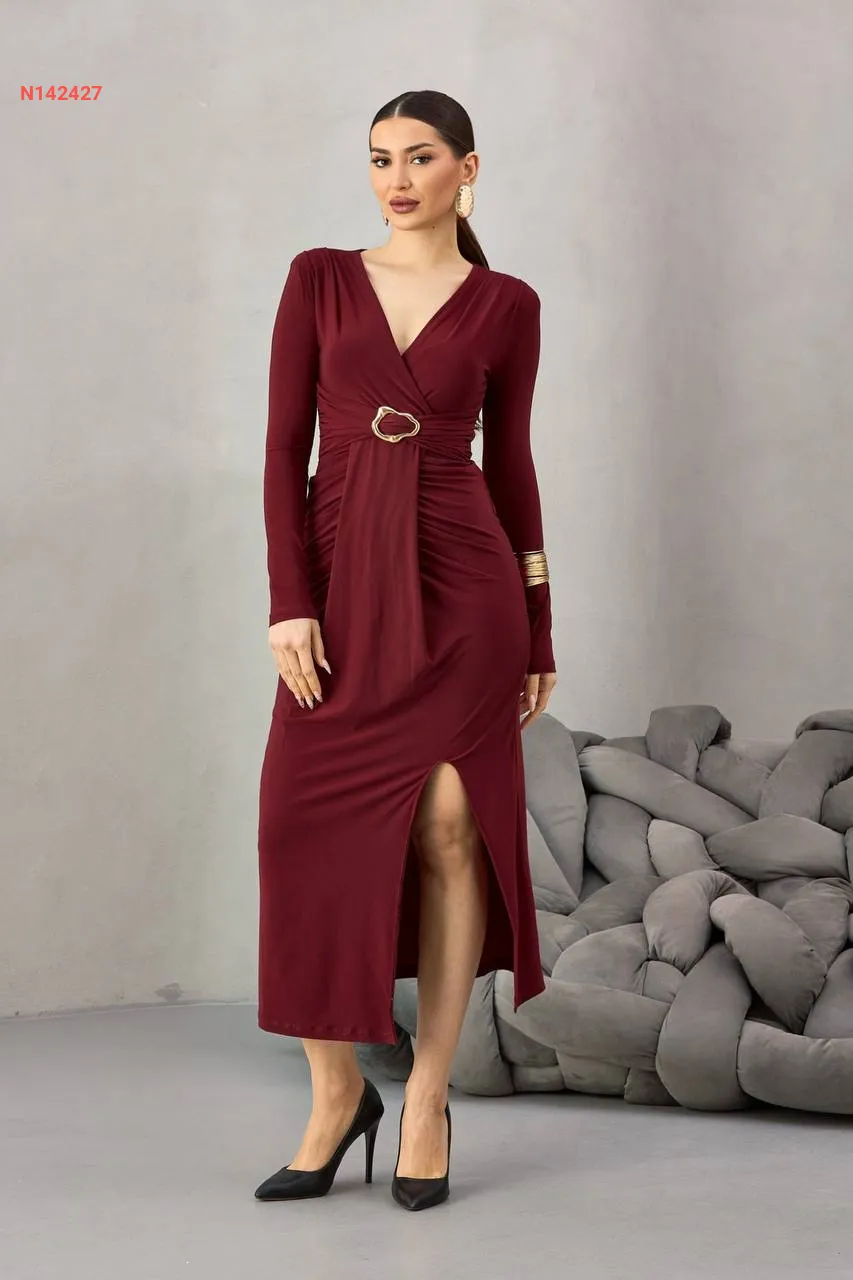 فستان طويل مجمع بإبزيم وفتحة جانبية