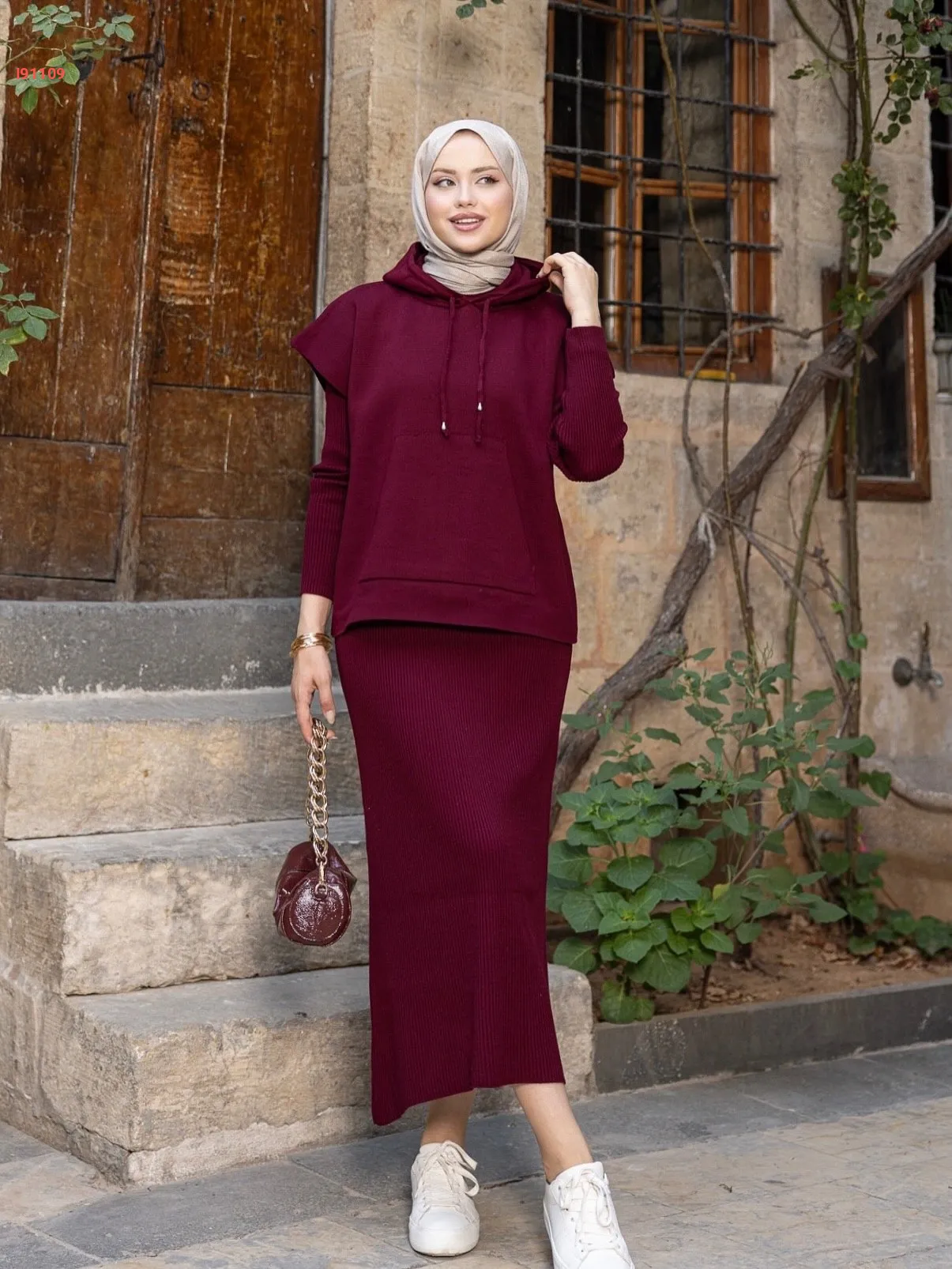 طقم تريكو فستان طويل مع كنزة بطاقية