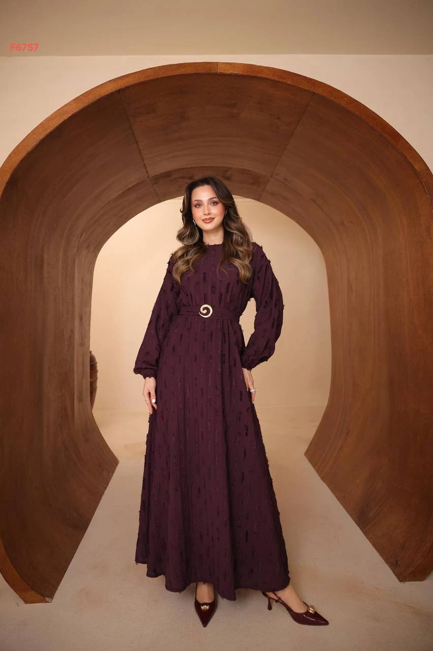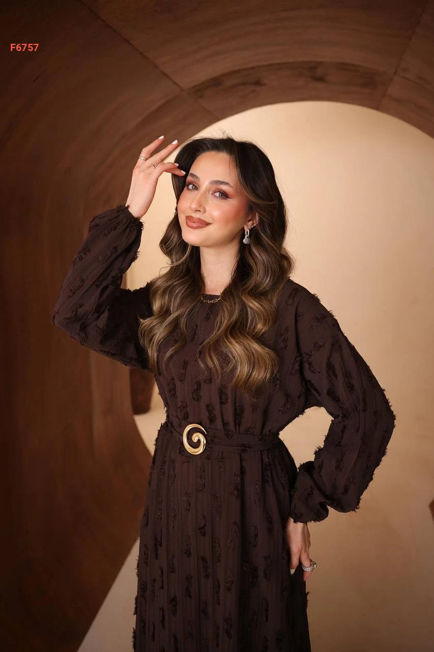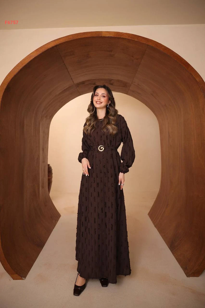 فستان طويل مع زنار وبروش