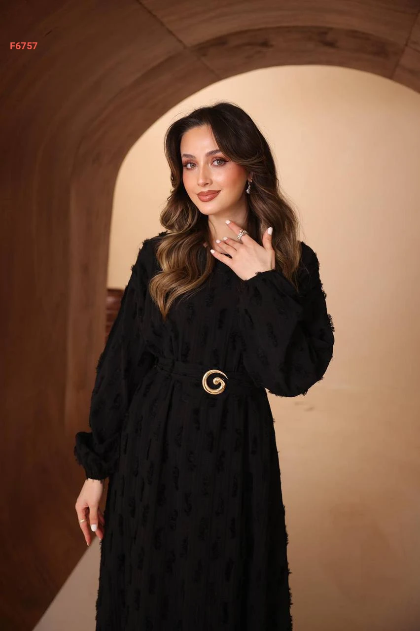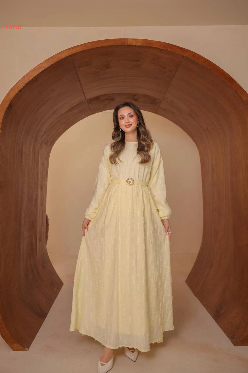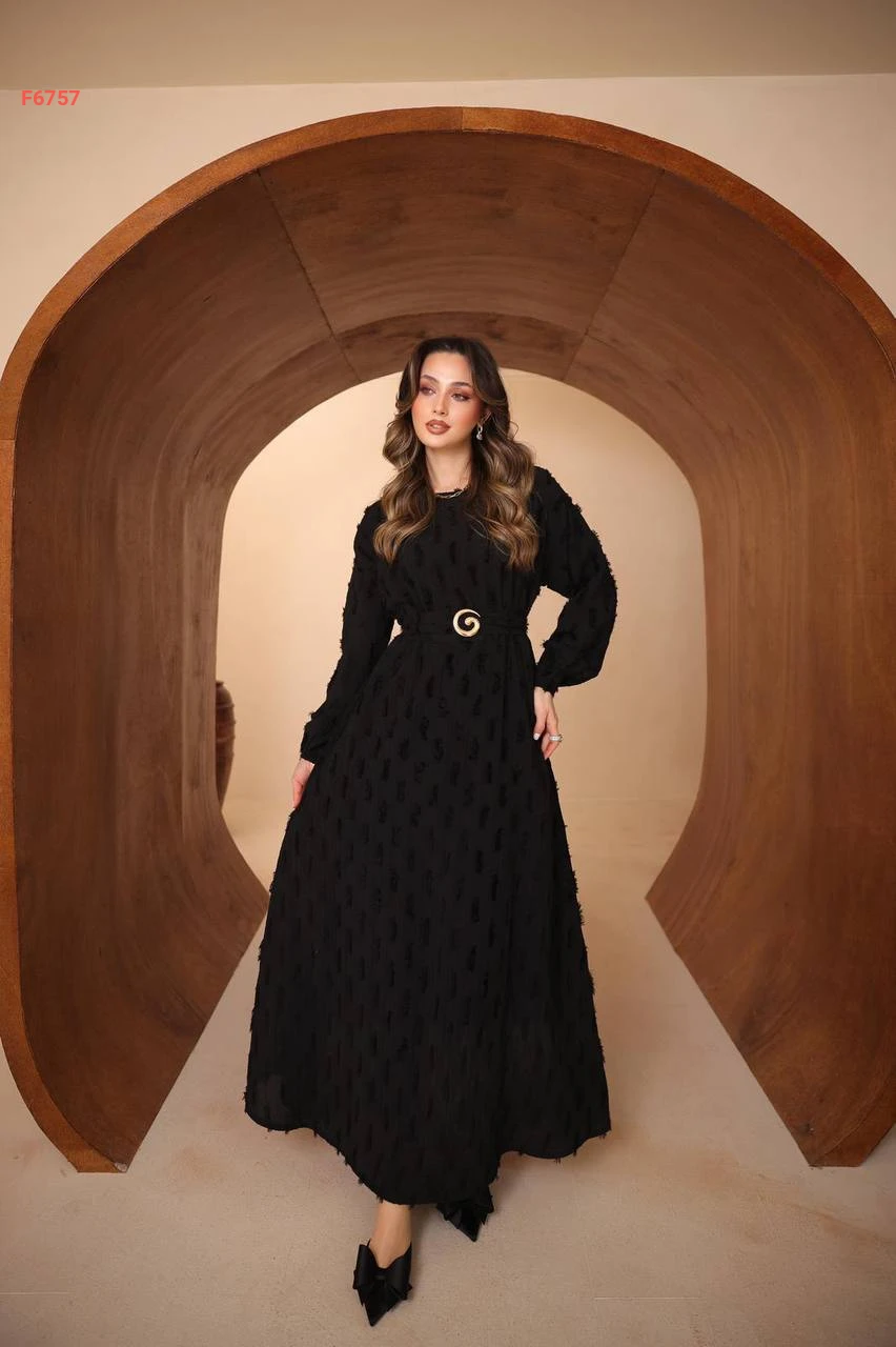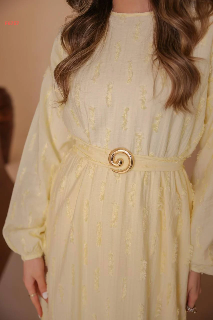 فستان طويل مع زنار وبروش
