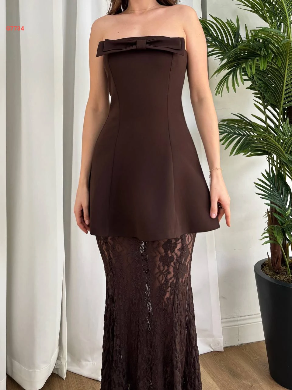 فستان طويل cut بفيونكة عالصدر ودانتيل
