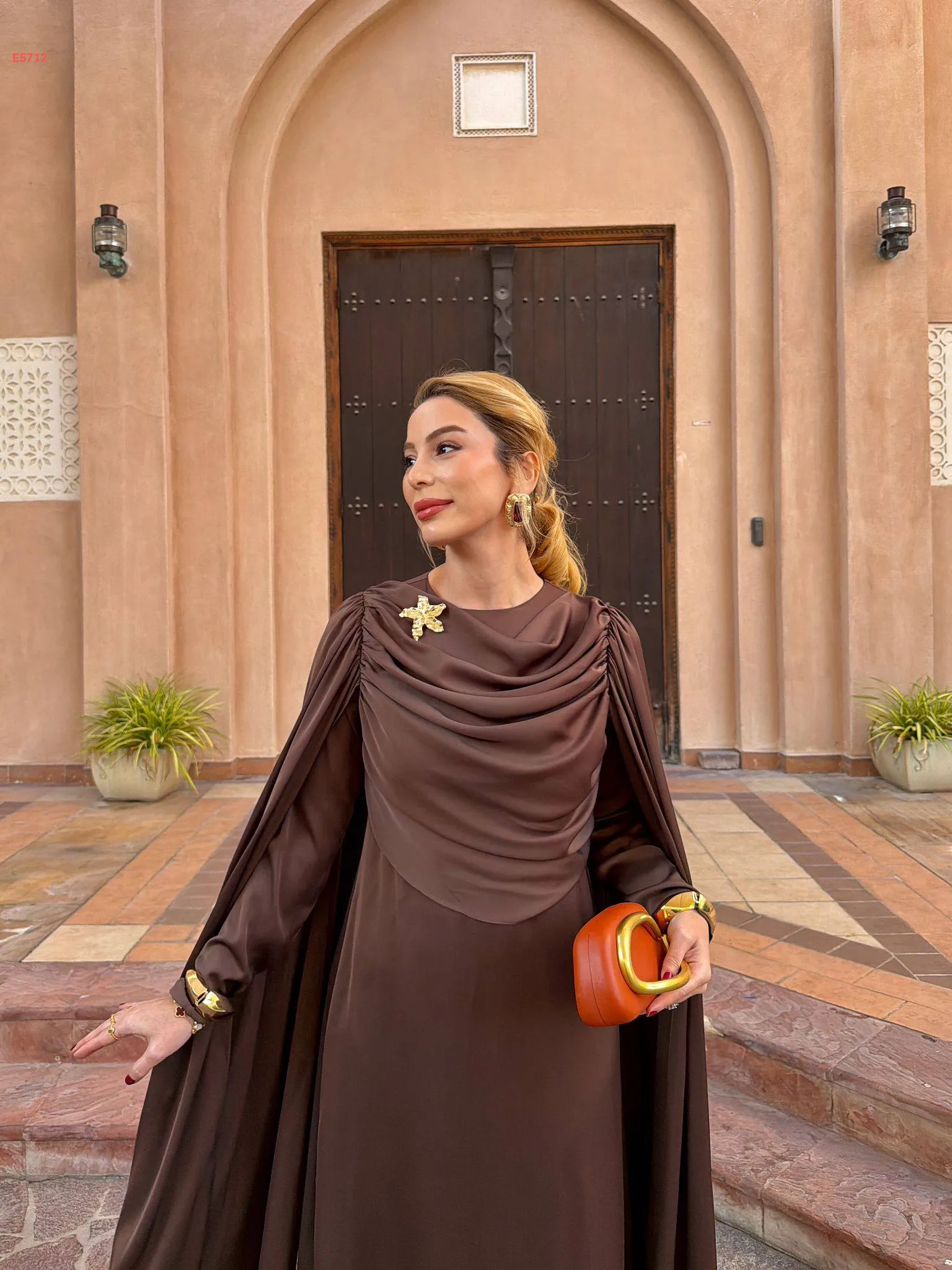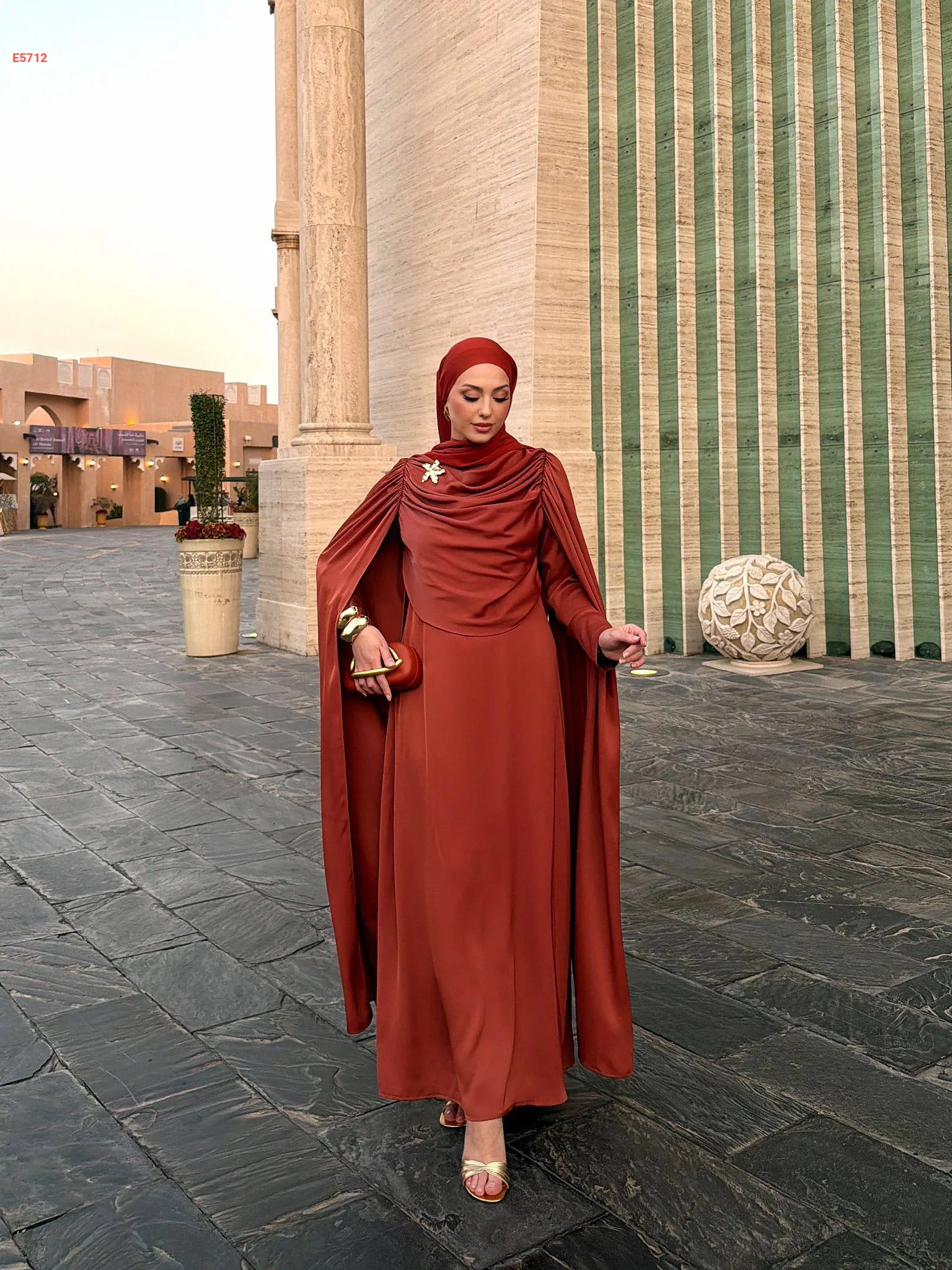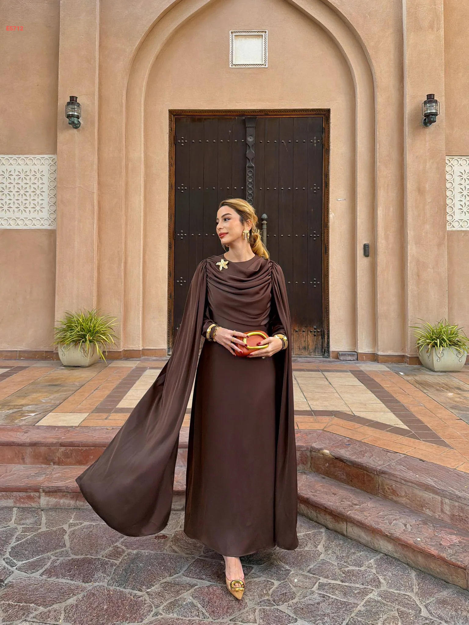 فستان طويل ببروش دهبي وشاحط