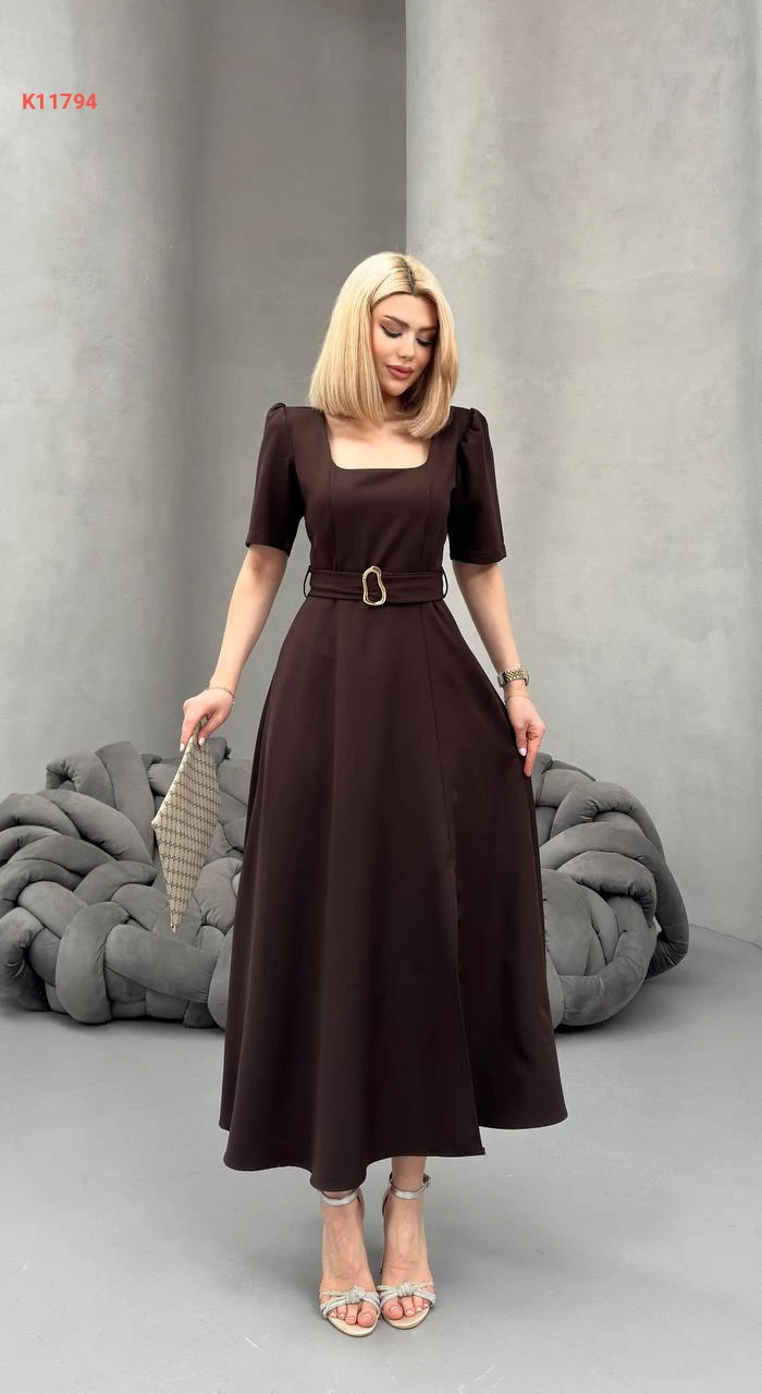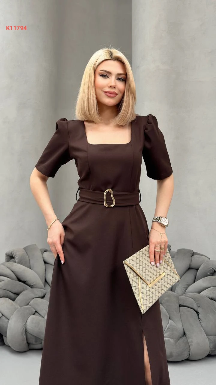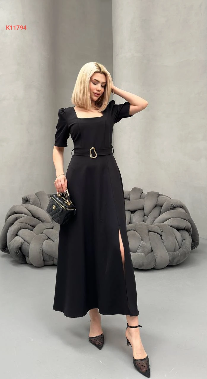 فستان طويل بفتحة جانبية وحزام