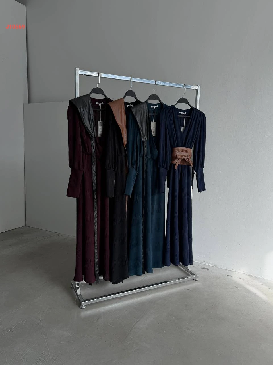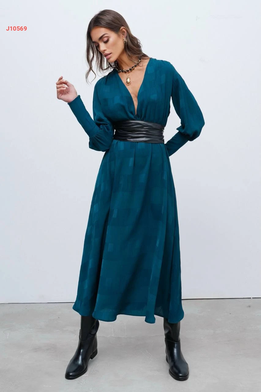 فستان طويل مع حزام جلد عريض