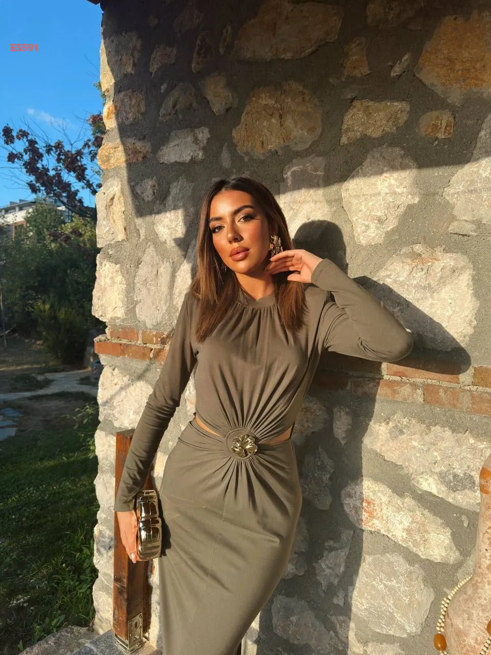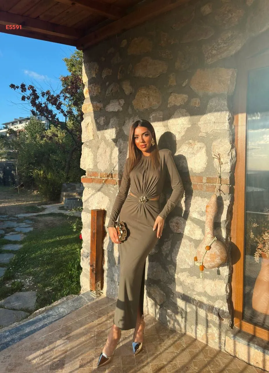 فستان طويل مكشوف الخصر مجمع ببروش