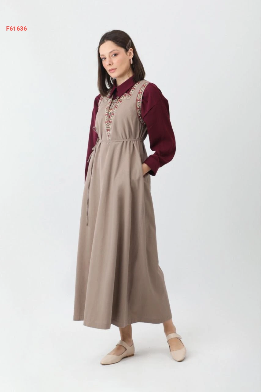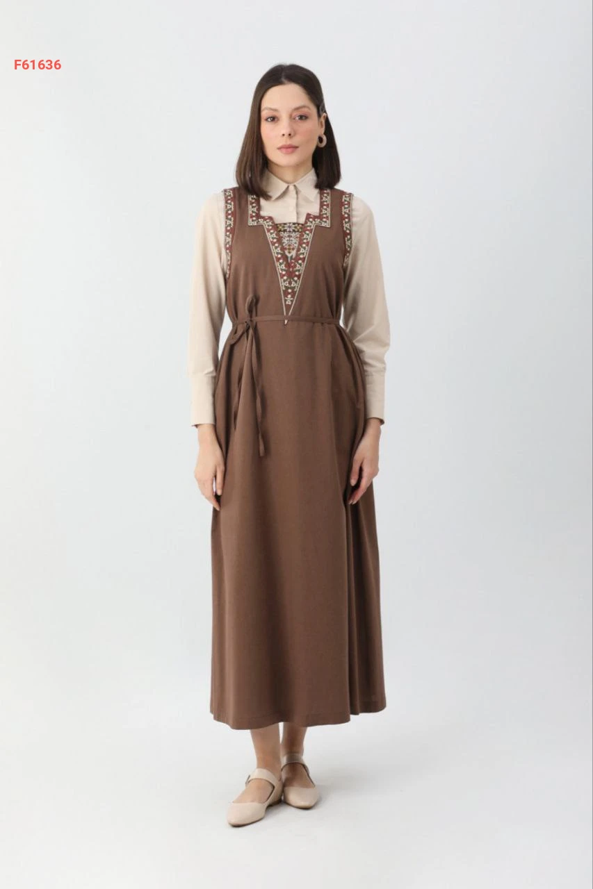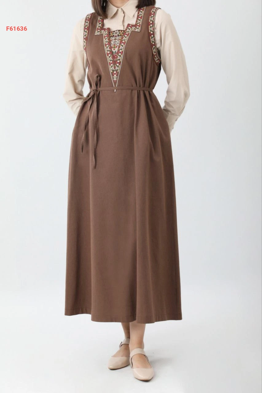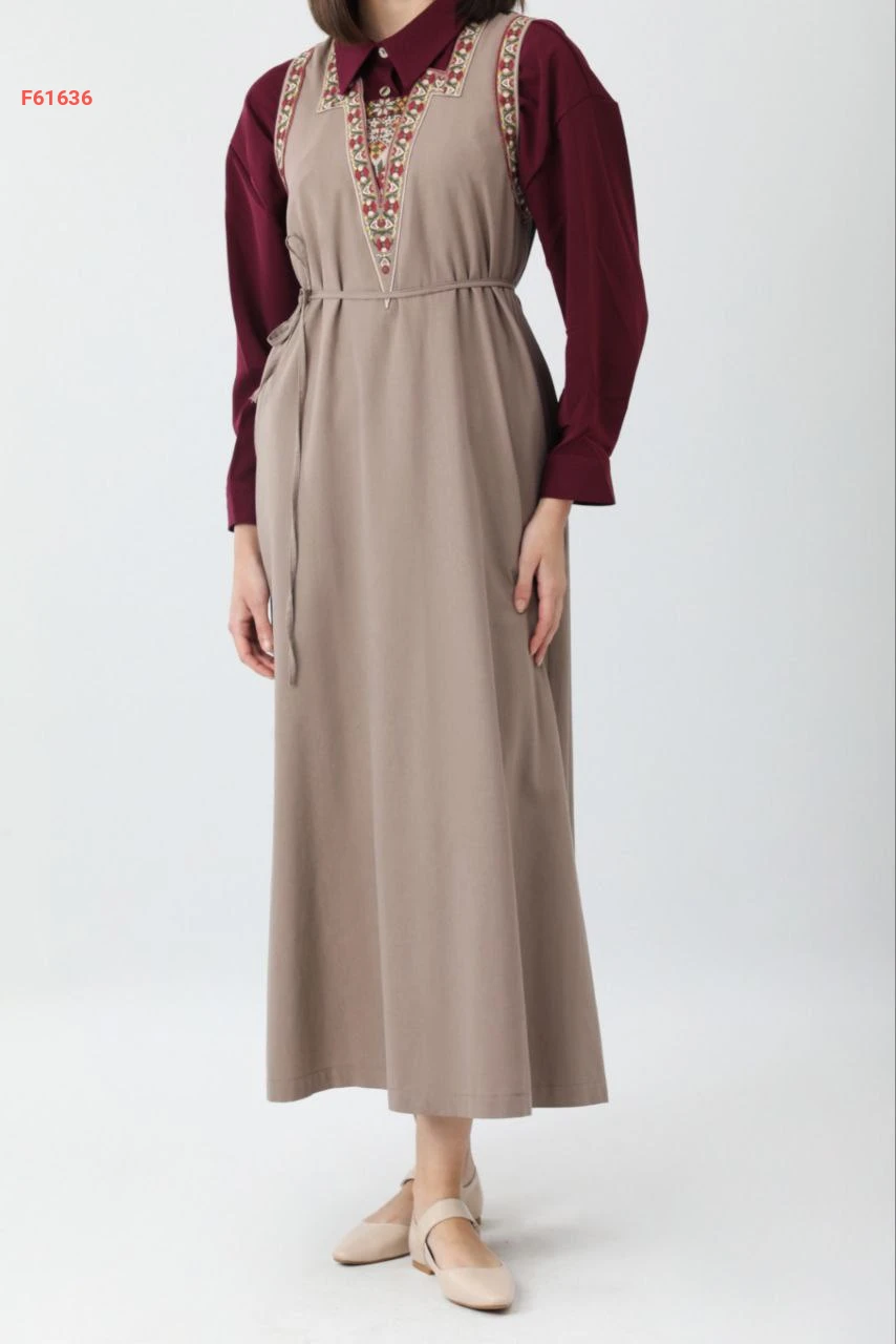فستان طويل حفر بياقة مفتوحة مطرزة مع ربطة خصر وجيب