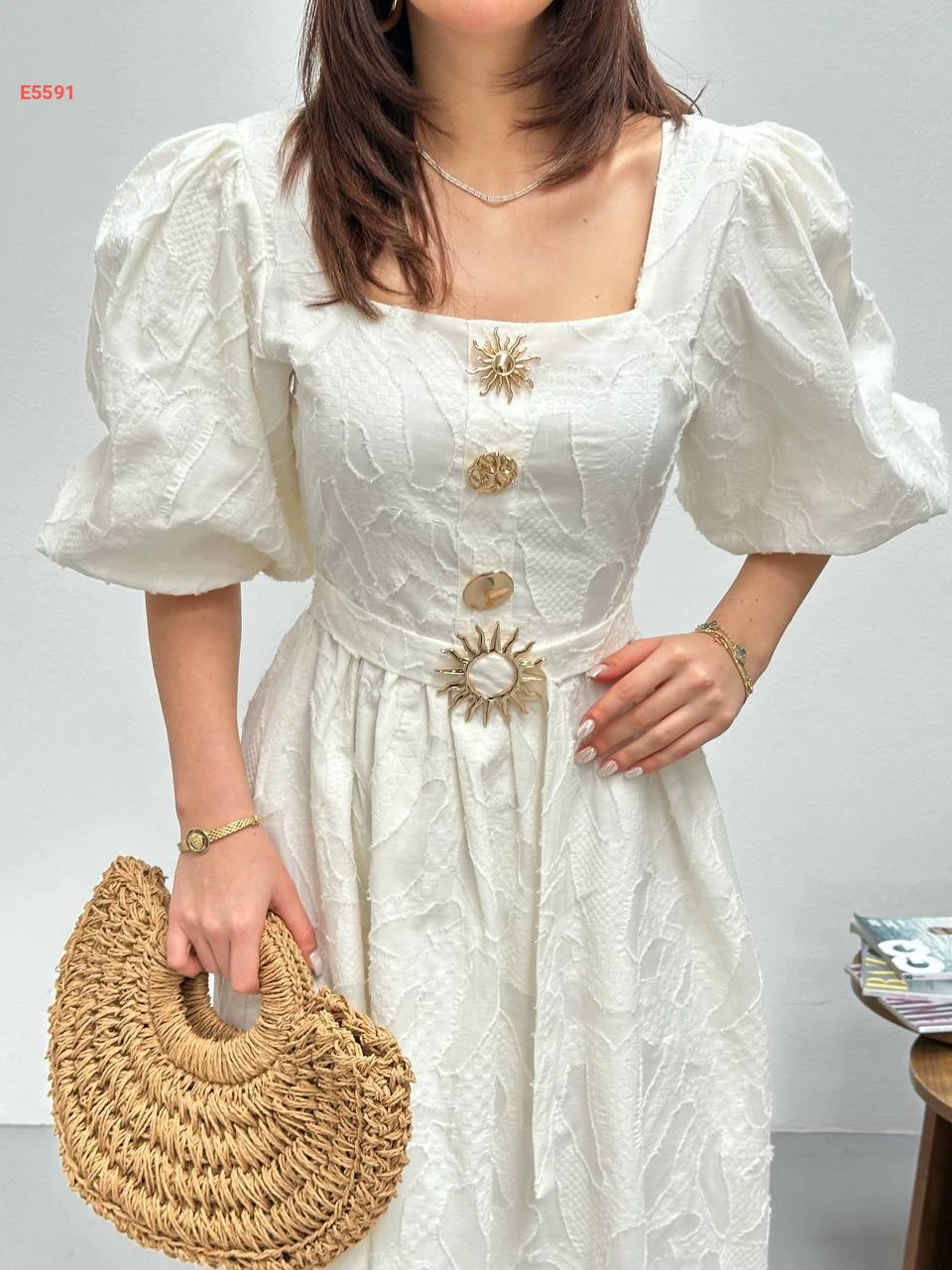 فستان طويل مطرز بأكمام بالون واكسسوار