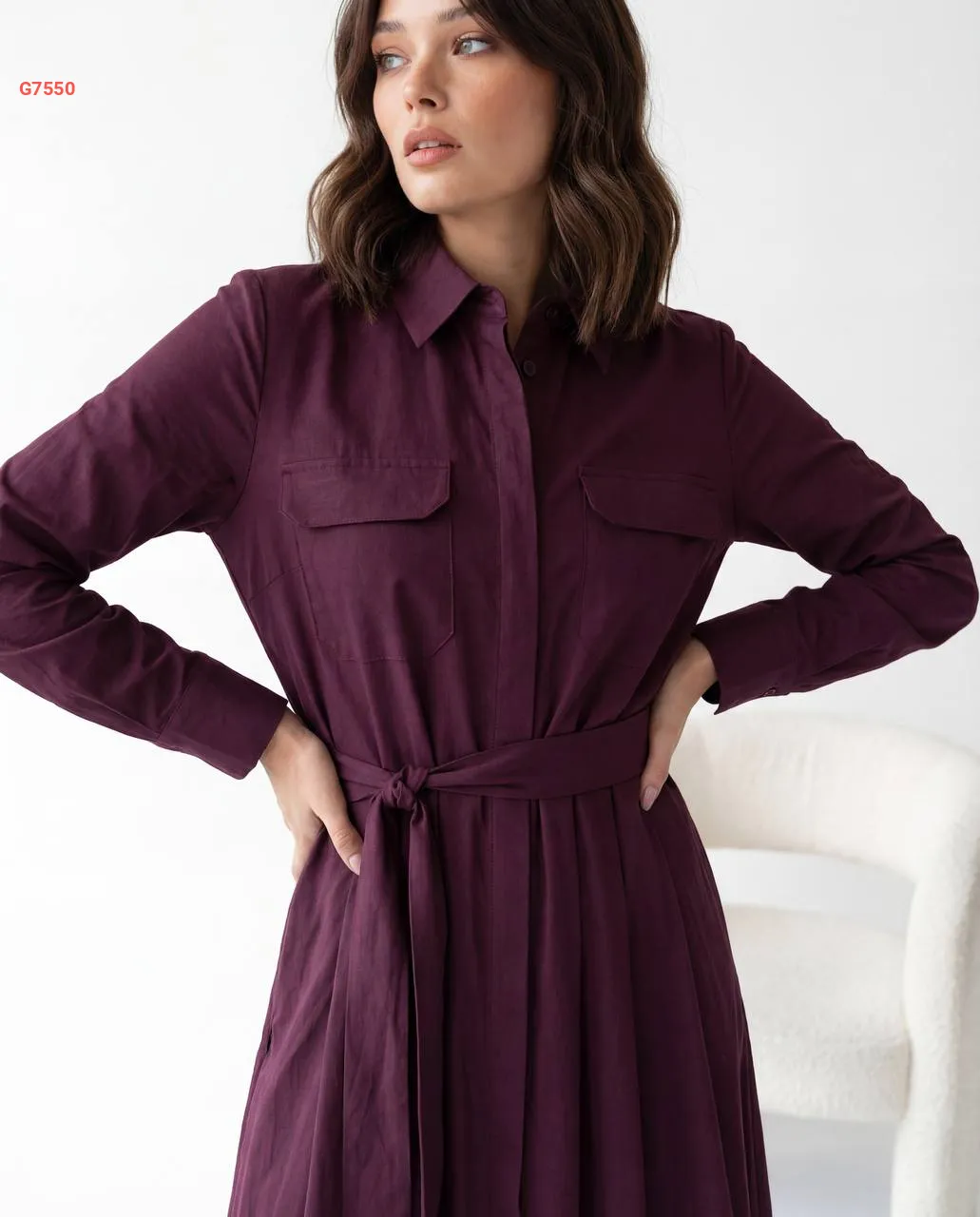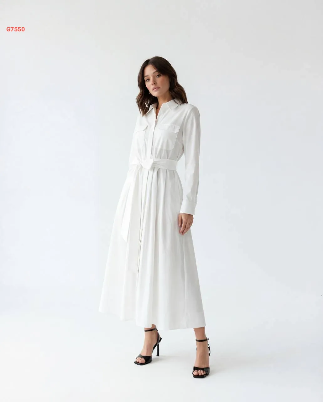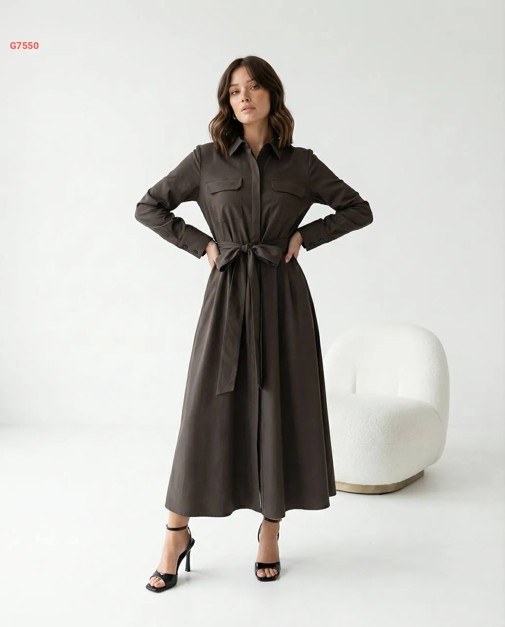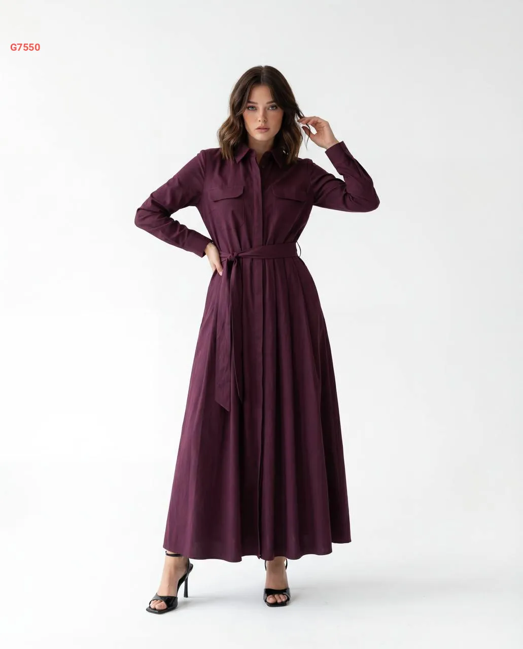 فستان طويل بأزرار وزنار