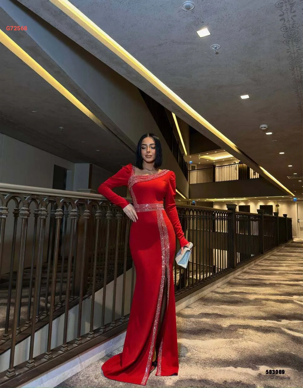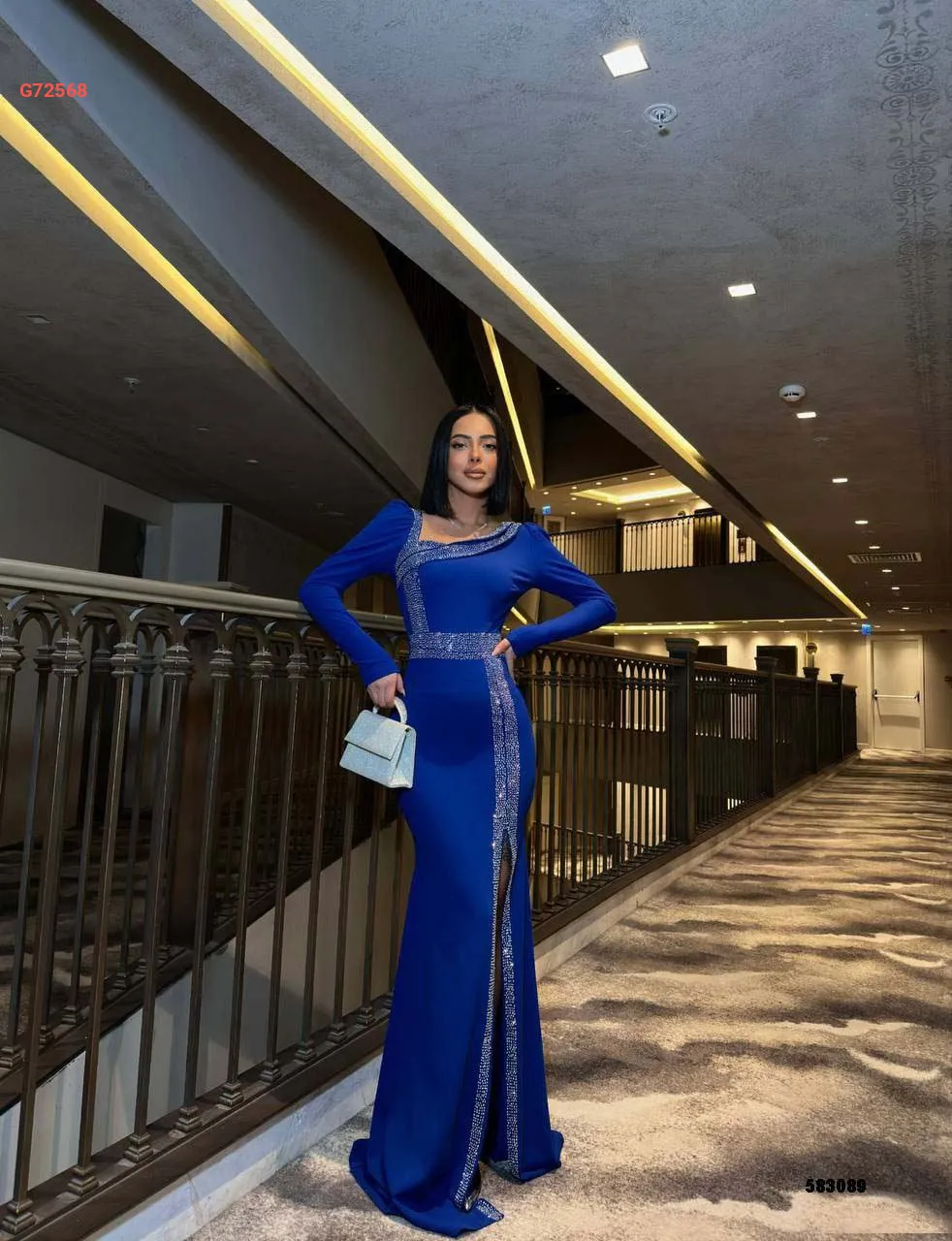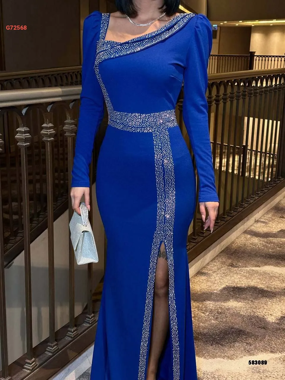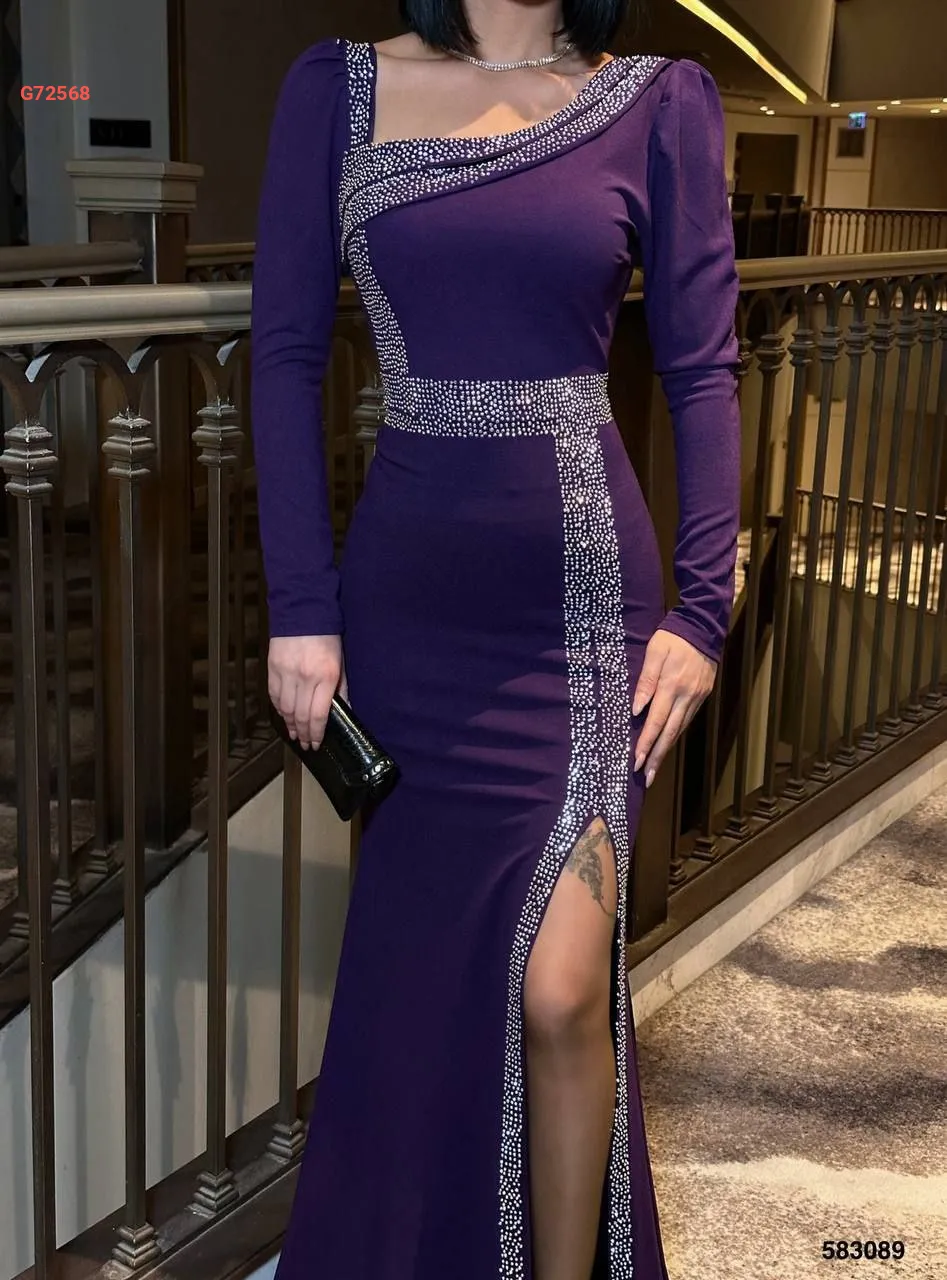 فستان طويل بألماس وفتحة جانبية
