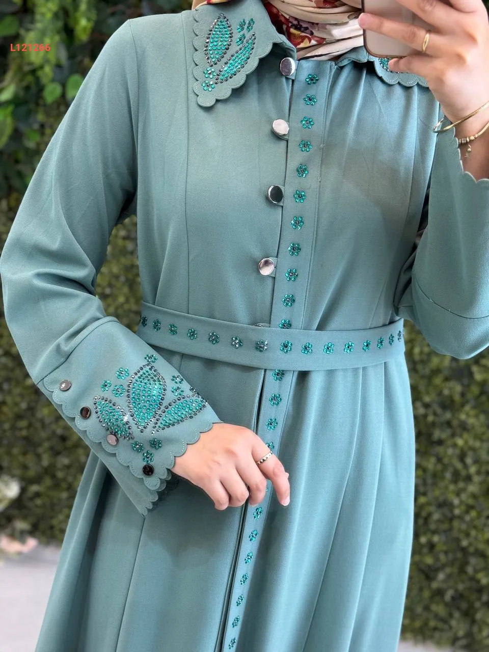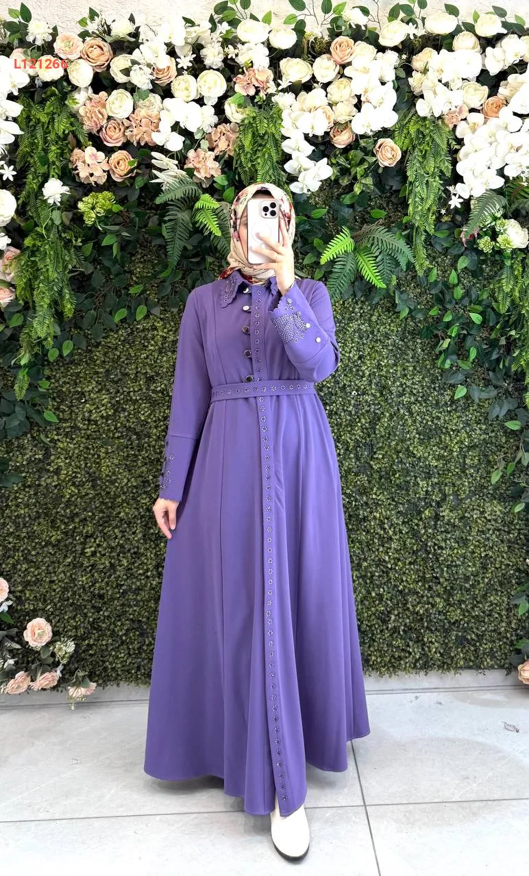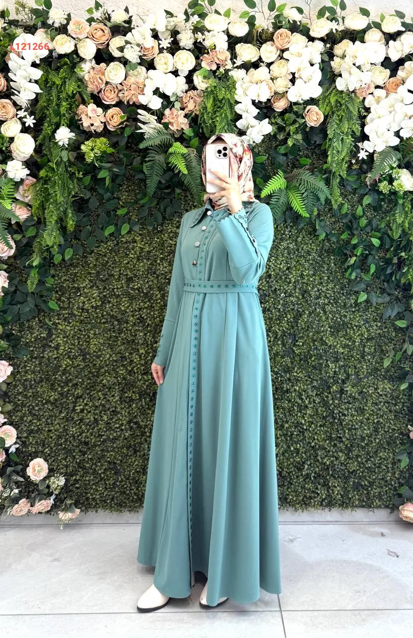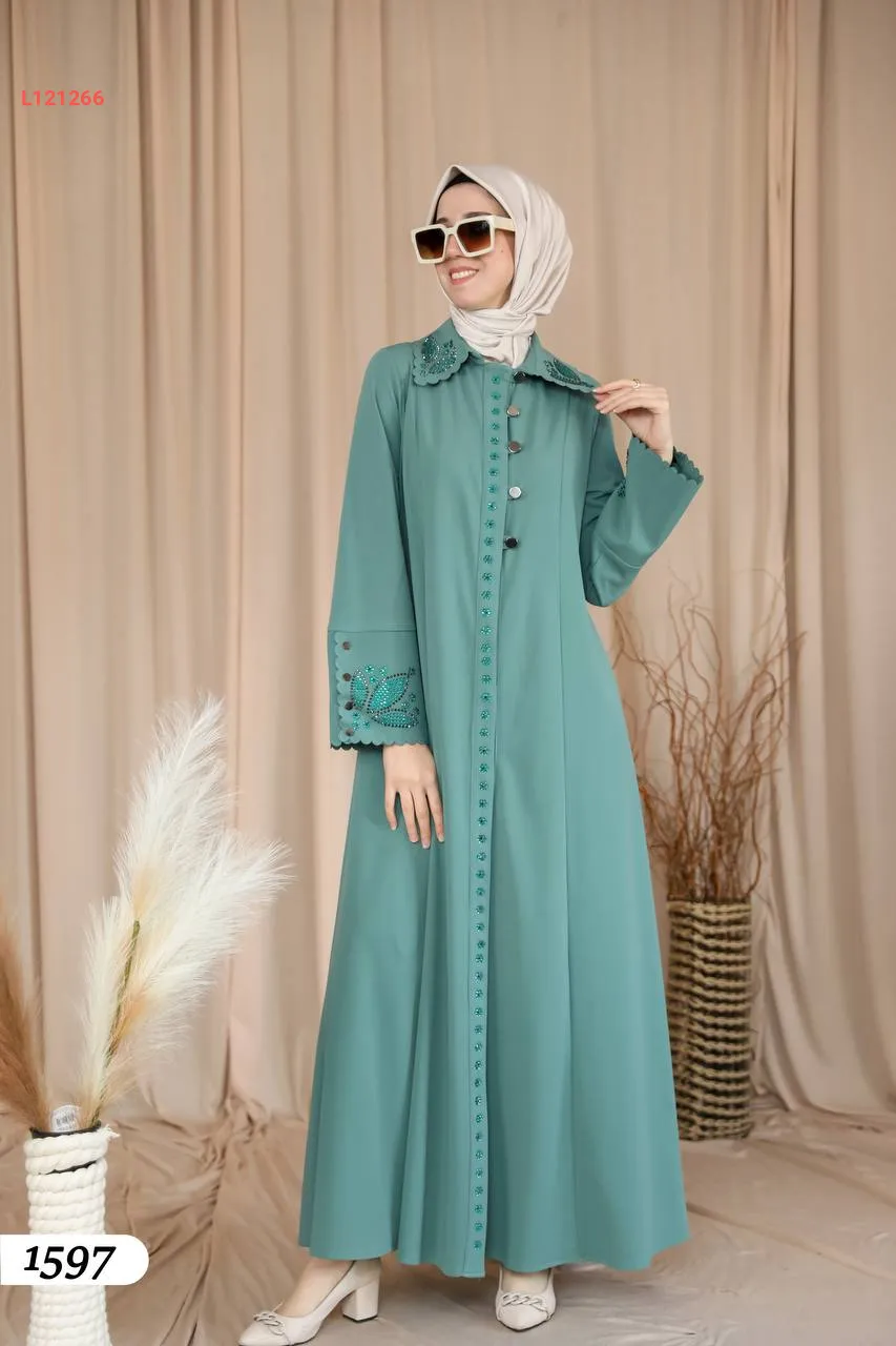 فستان طويل بأزرار مطرز ستراس