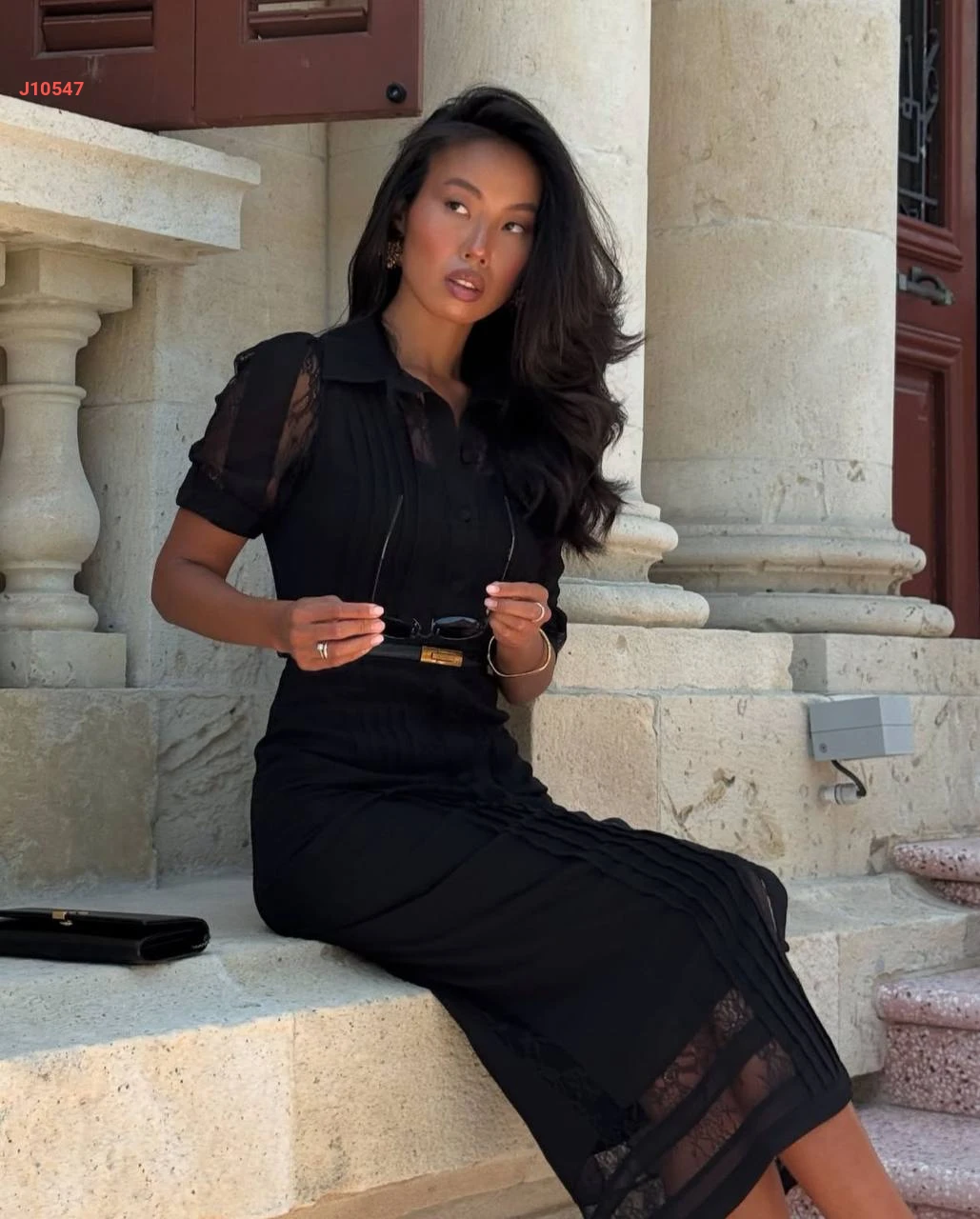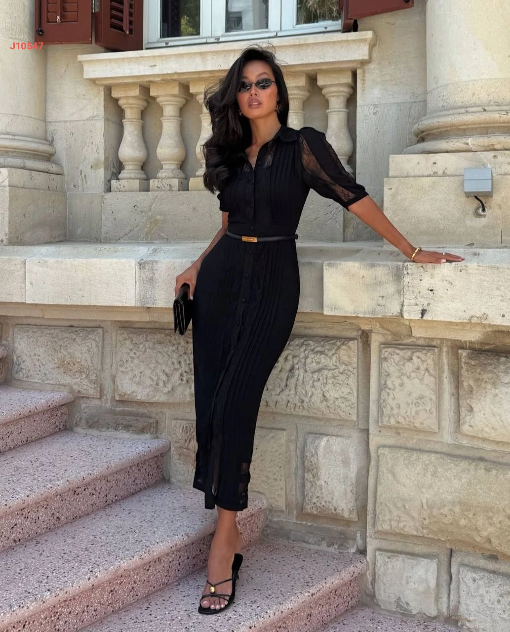 فستان طويل بأزرار مكلف دانتيل