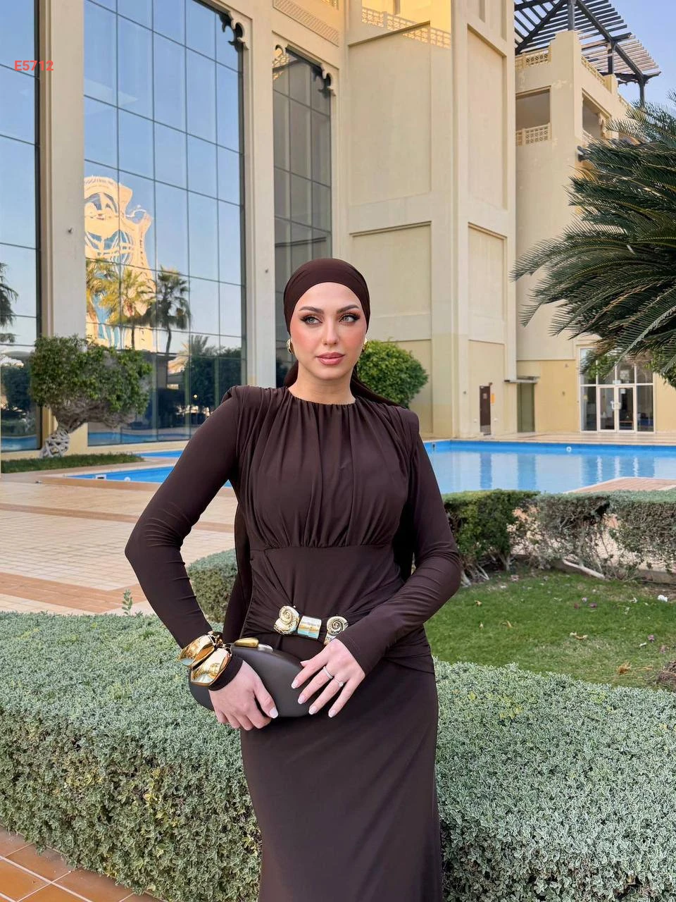 فستان طويل بتفاصيل مجمعة وبروش