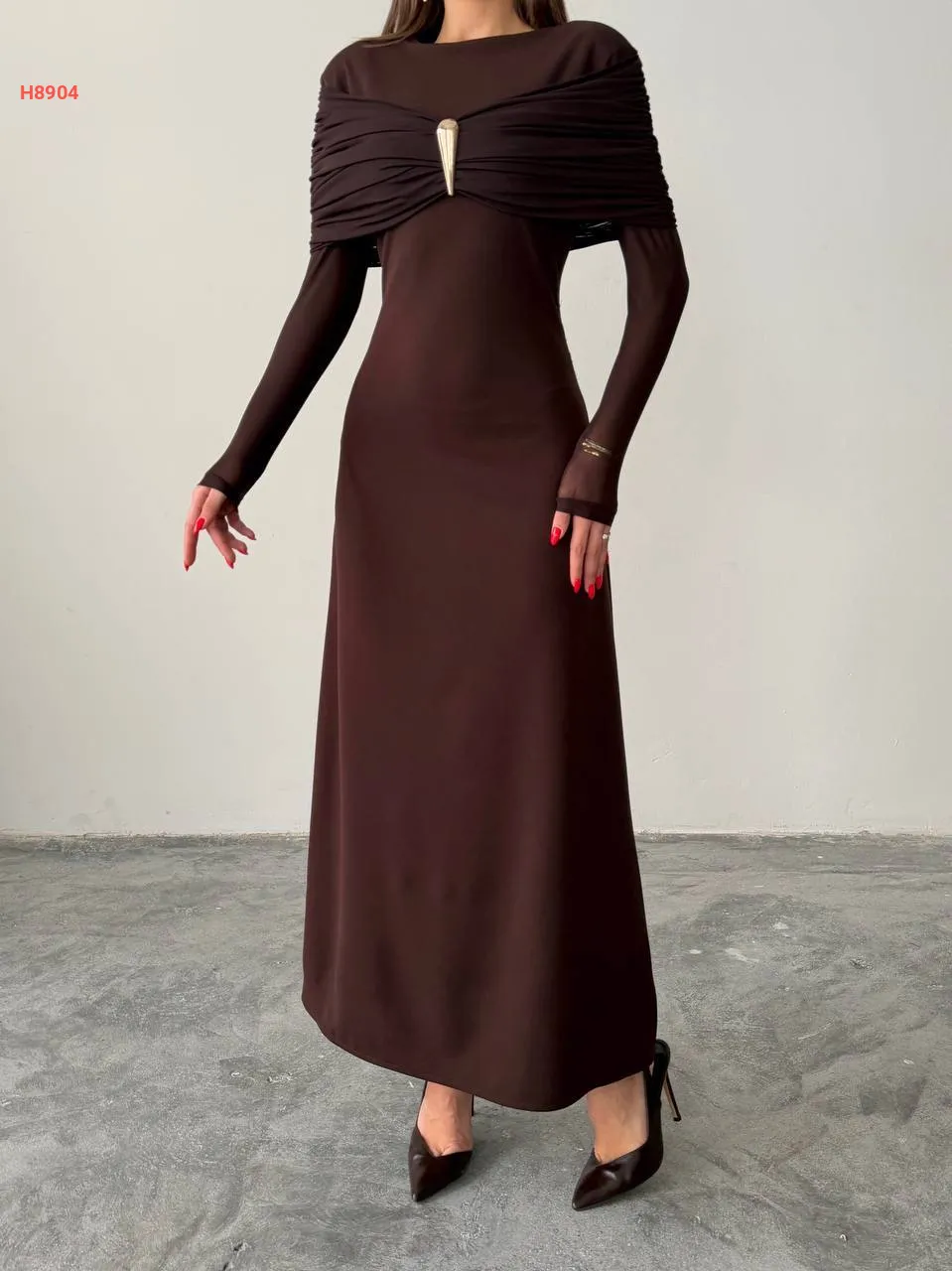فستان طويل بتفاصيل مجمعة وبروش دهبي