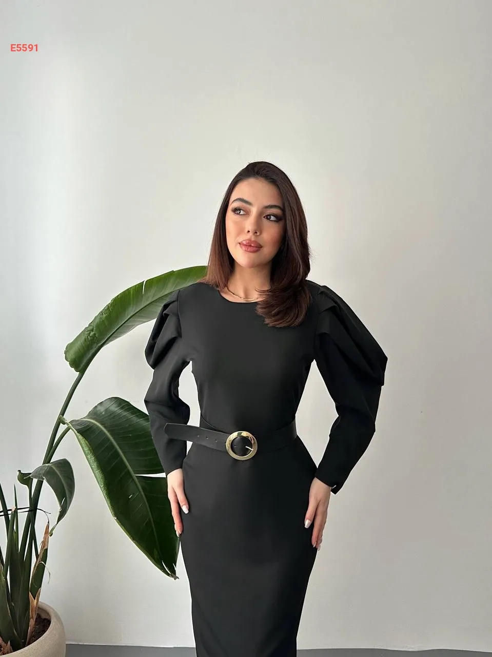 فستان طويل بأكمام مجمعة وحزام