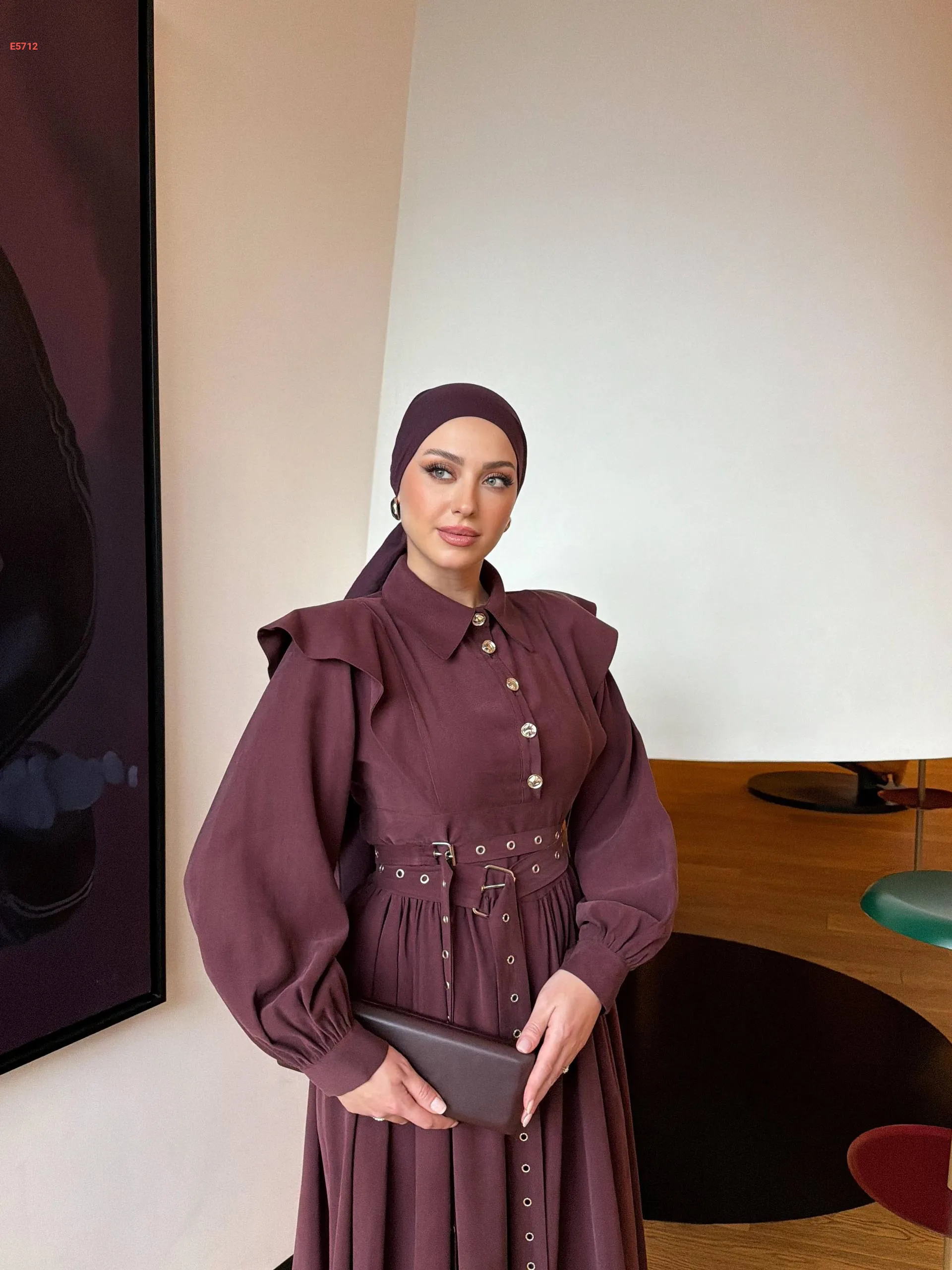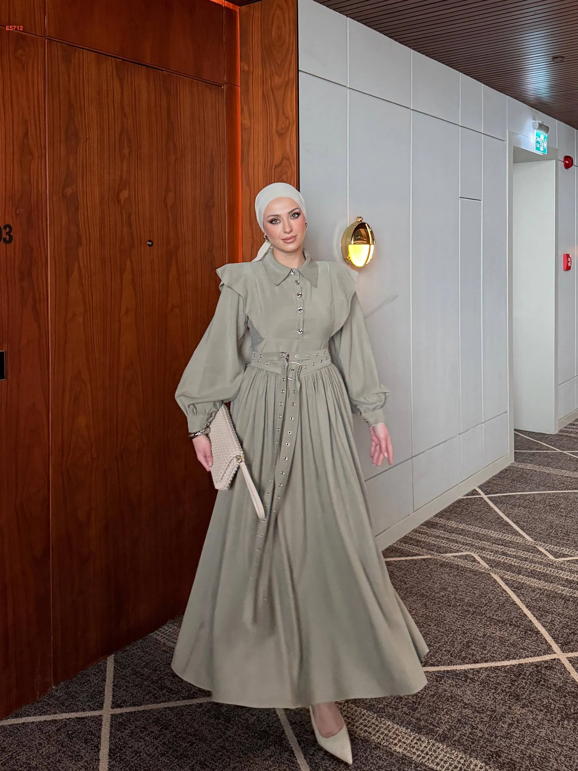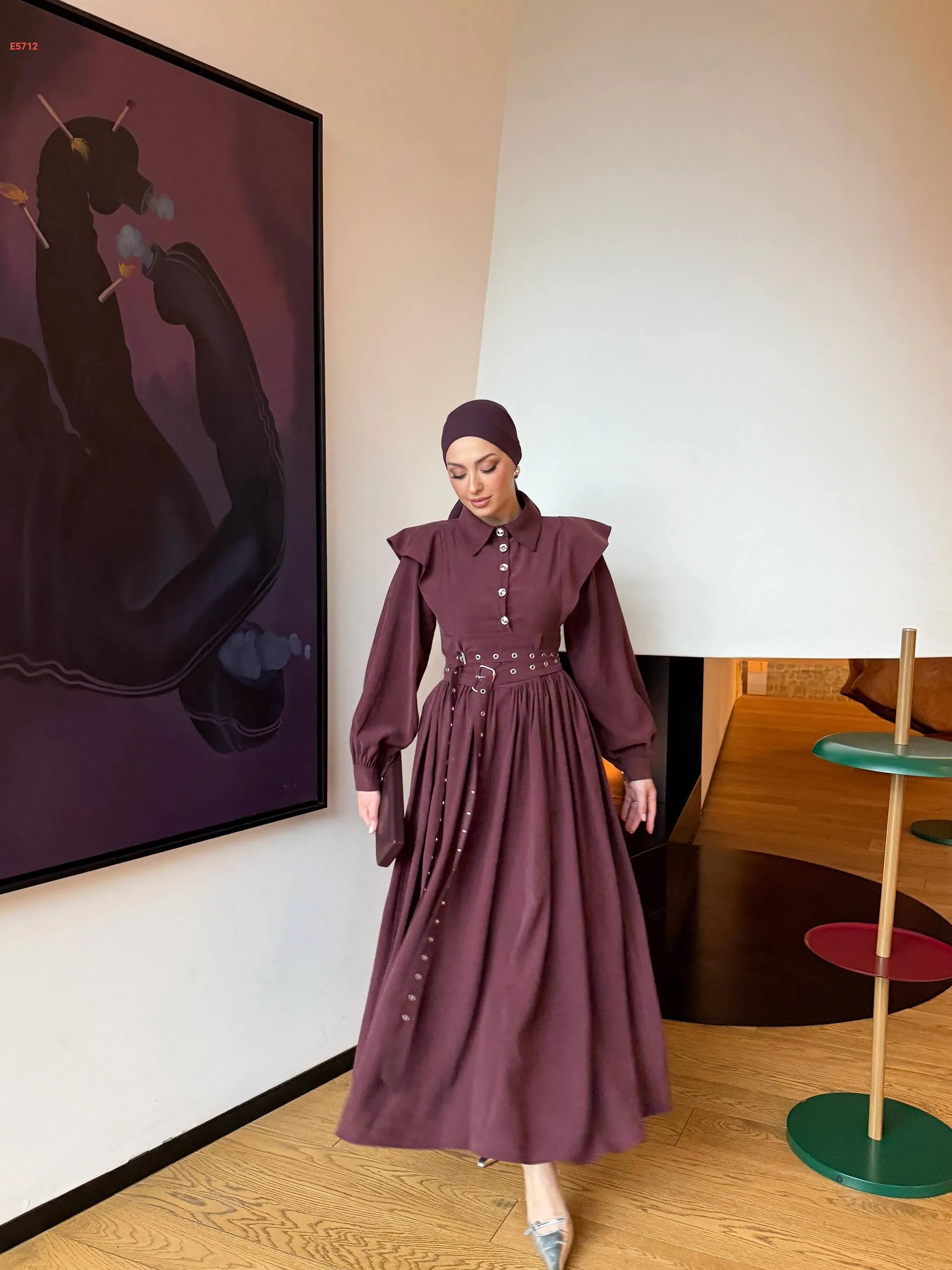 فستان طويل بأزرار نصفية وحزام